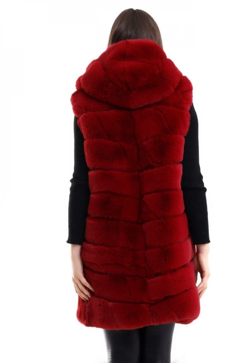 Kapşonlu Peluş Kürk Yelek Premium Kalite, Tam Astarlı, Uzun Model - Kırmızı