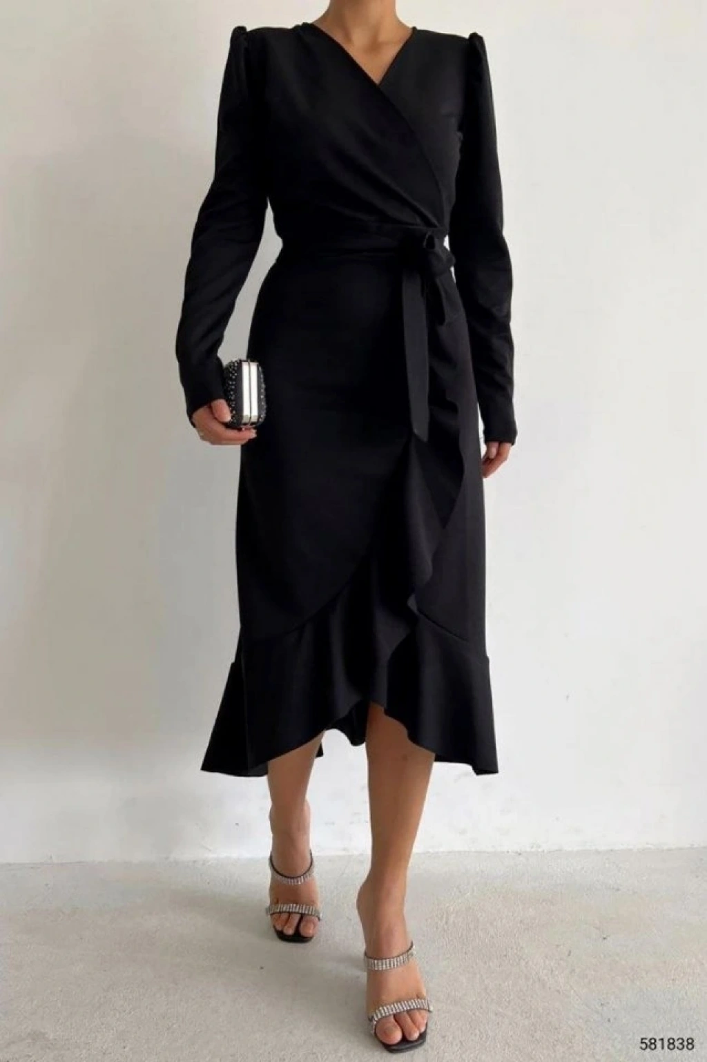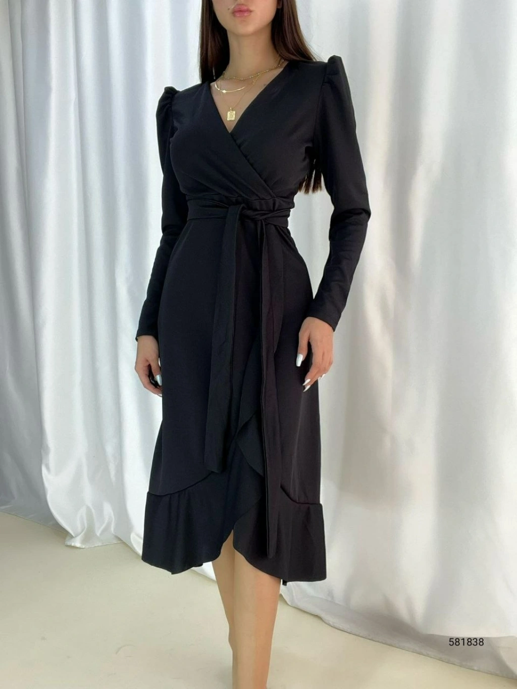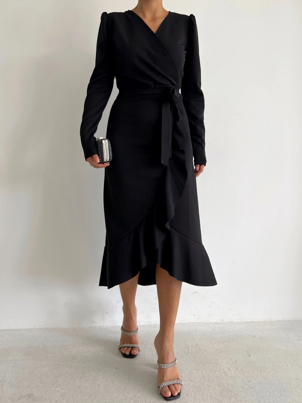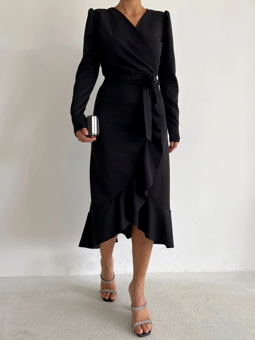 Krep Kumaş Midi Boy Kuşaklı Uzunkol Elbise 113 Cm
