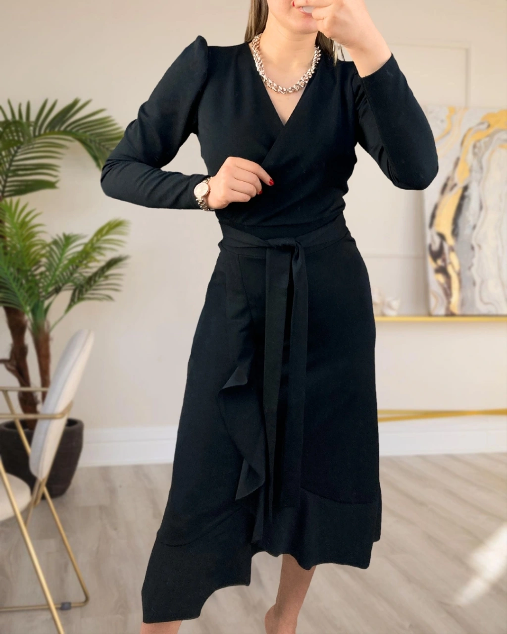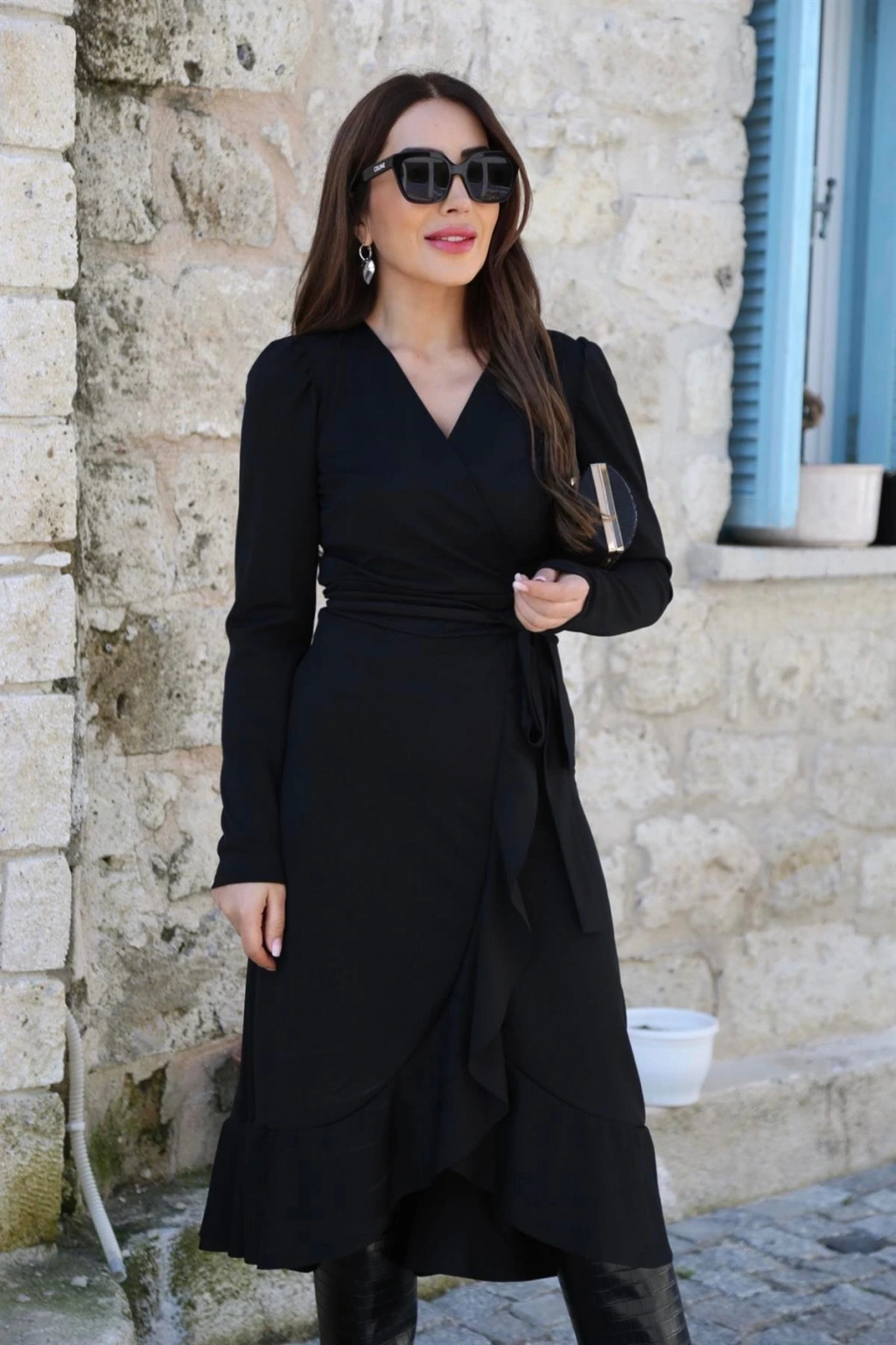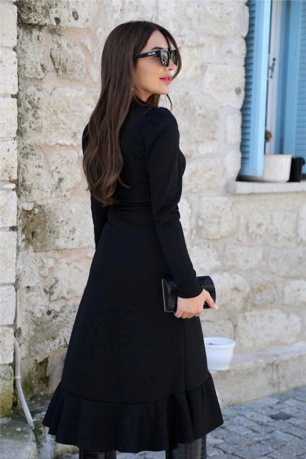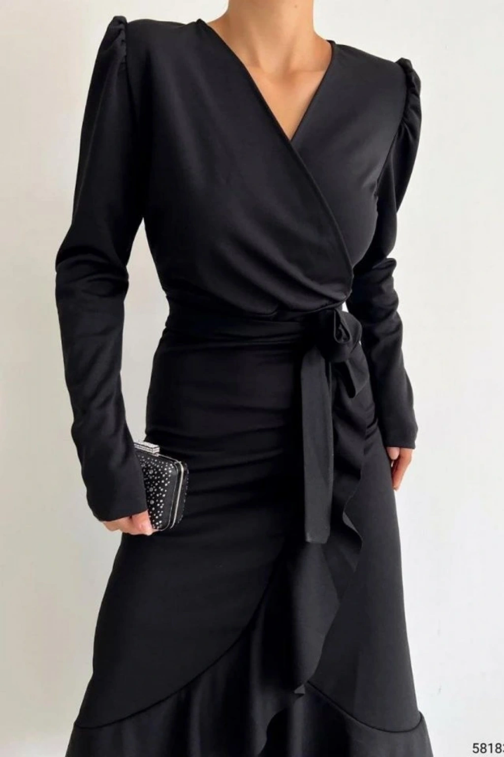 Krep Kumaş Midi Boy Kuşaklı Uzunkol Elbise 113 Cm