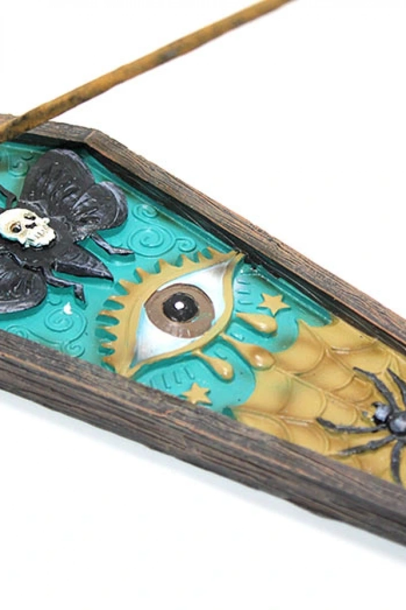POLYESTER TÜTSÜLÜK MODEL 2Ürün ÖzellikleriPolyester tütsülük model 2, gotik ve mistik tasarımıyla dikkat çeken özel bir tütsü standıdır. Dayanıklı polyester malzemeden üretilmiş olup, uzun süreli kullanım imkanı sunar. Tabut şeklindeki çerçevesi ve üzerinde bulunan semboller, büyülü ve mistik bir hava katarken dekoratif bir obje olarak da kullanılabilir. Göz, örümcek ve kelebek gibi detaylar, ürüne sanatsal bir dokunuş ekler ve spiritüel çalışmalarınıza anlam katar. Tütsü çubuğunuzu güvenle yerleştirebileceğiniz bölmesi, tütsünün külünü etrafa dökülmeden toplamaya yardımcı olur. Meditasyon, yoga ve enerji dengeleme ritüelleri için mükemmel bir aksesuardır.Paket İçeriği1 adet Polyester Tütsülük Model 2