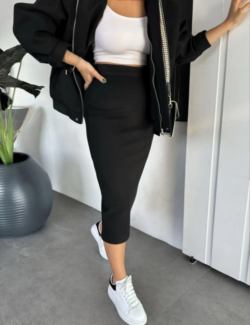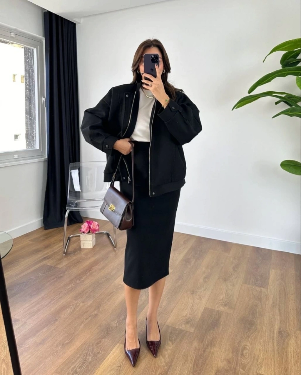 RYSE Mevsim Kaşe Fermuarlı Ceket Etek Takım Kaşmir Ceket Etekli İkili Takım Kaşe Bomber Ceket-Etek Takım