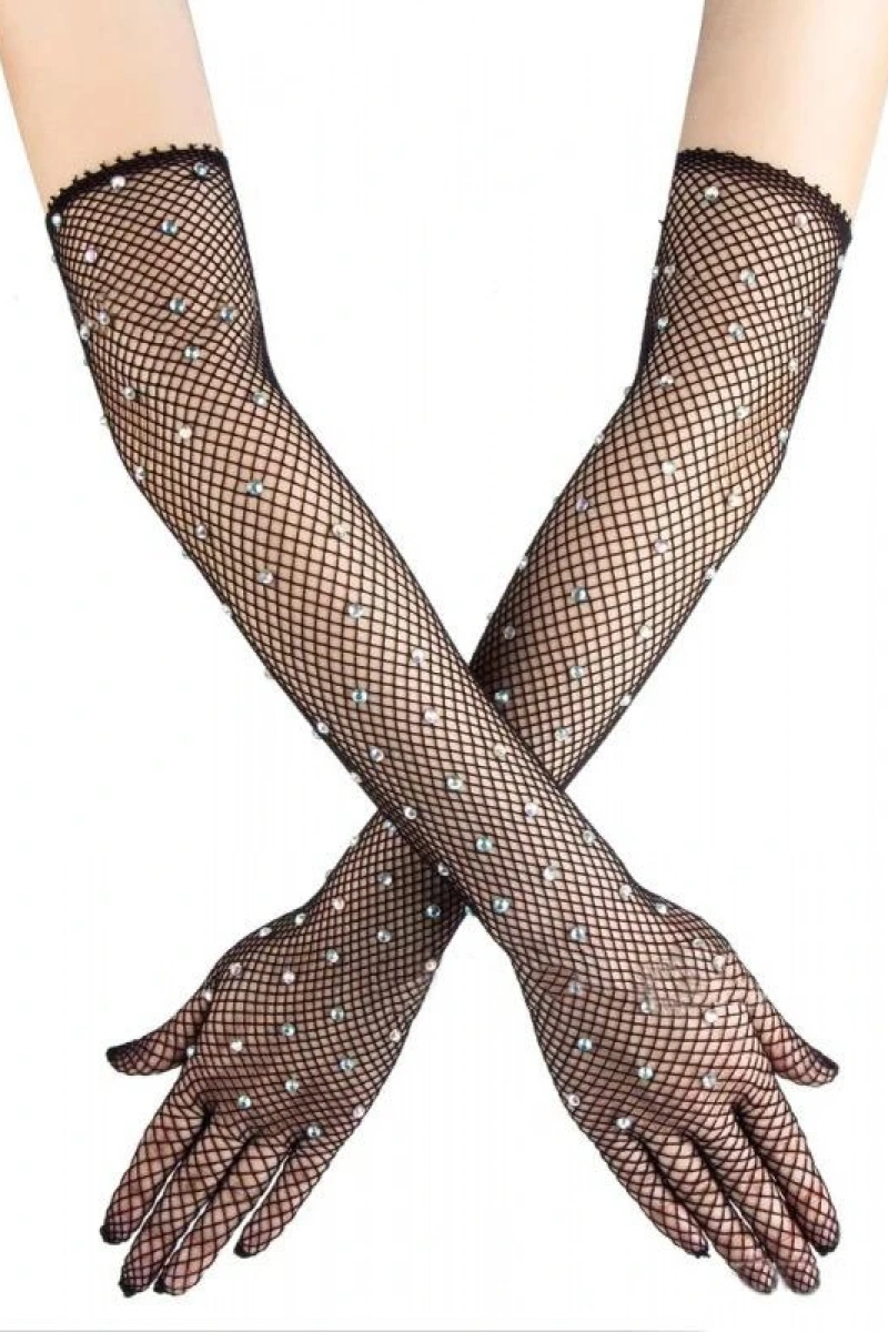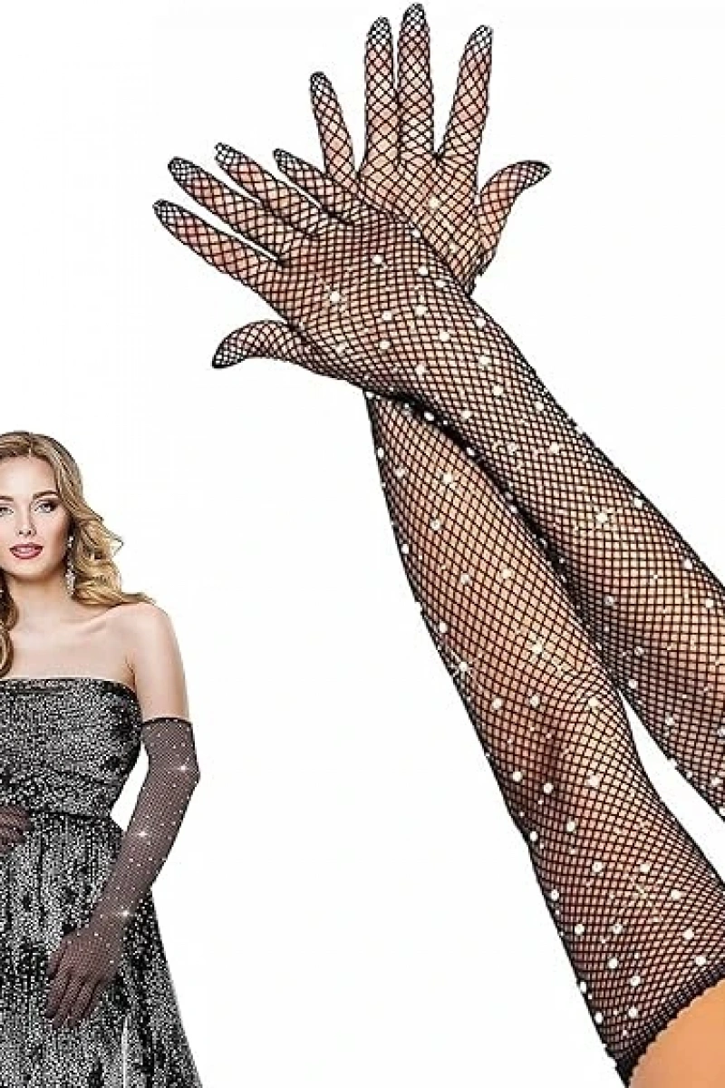 Siyah İncili Elmas File Örgü Uzun Eldiven