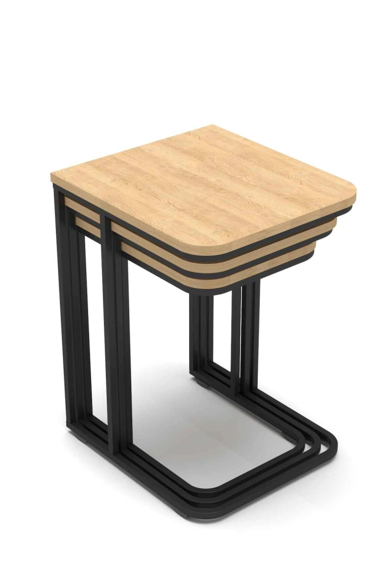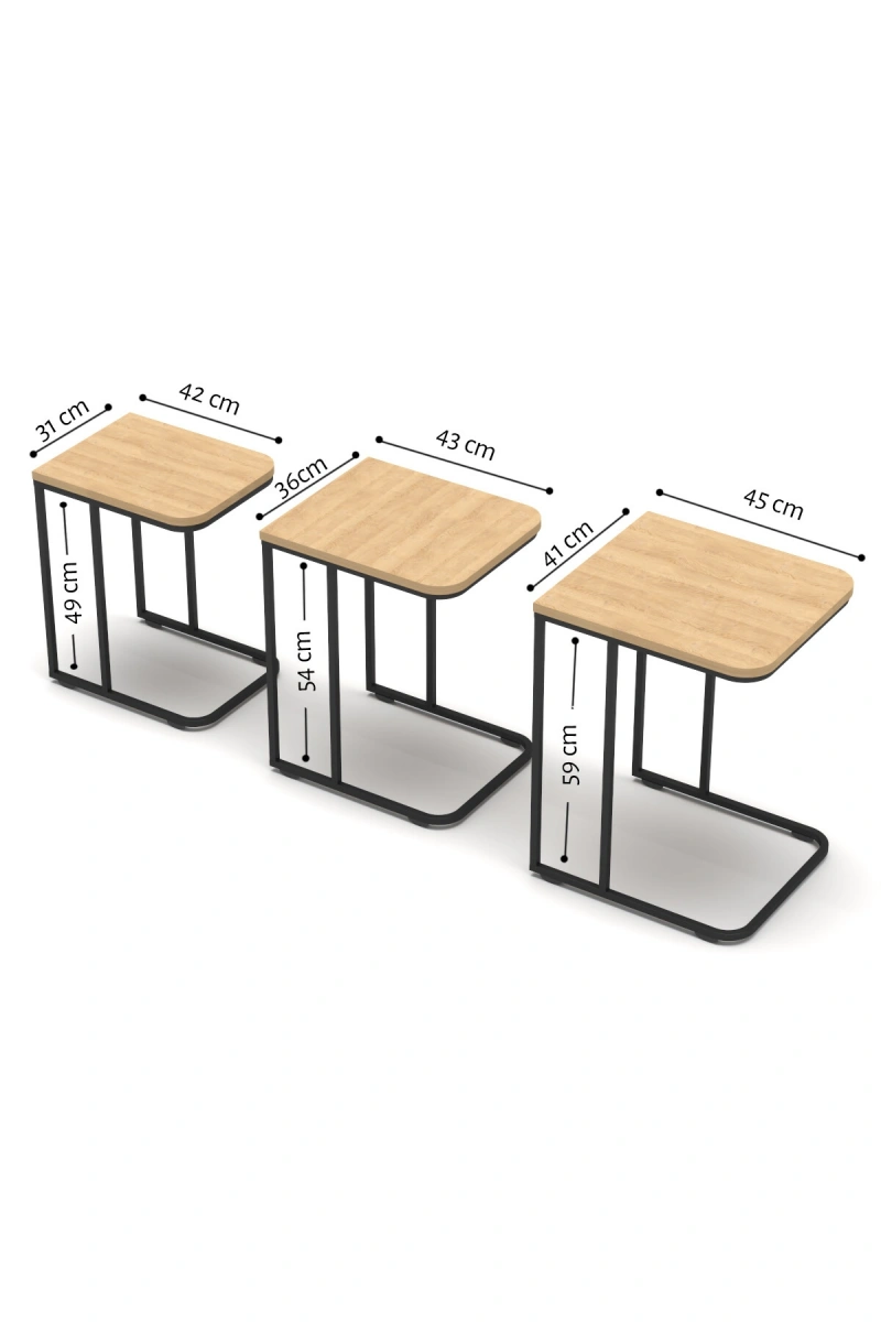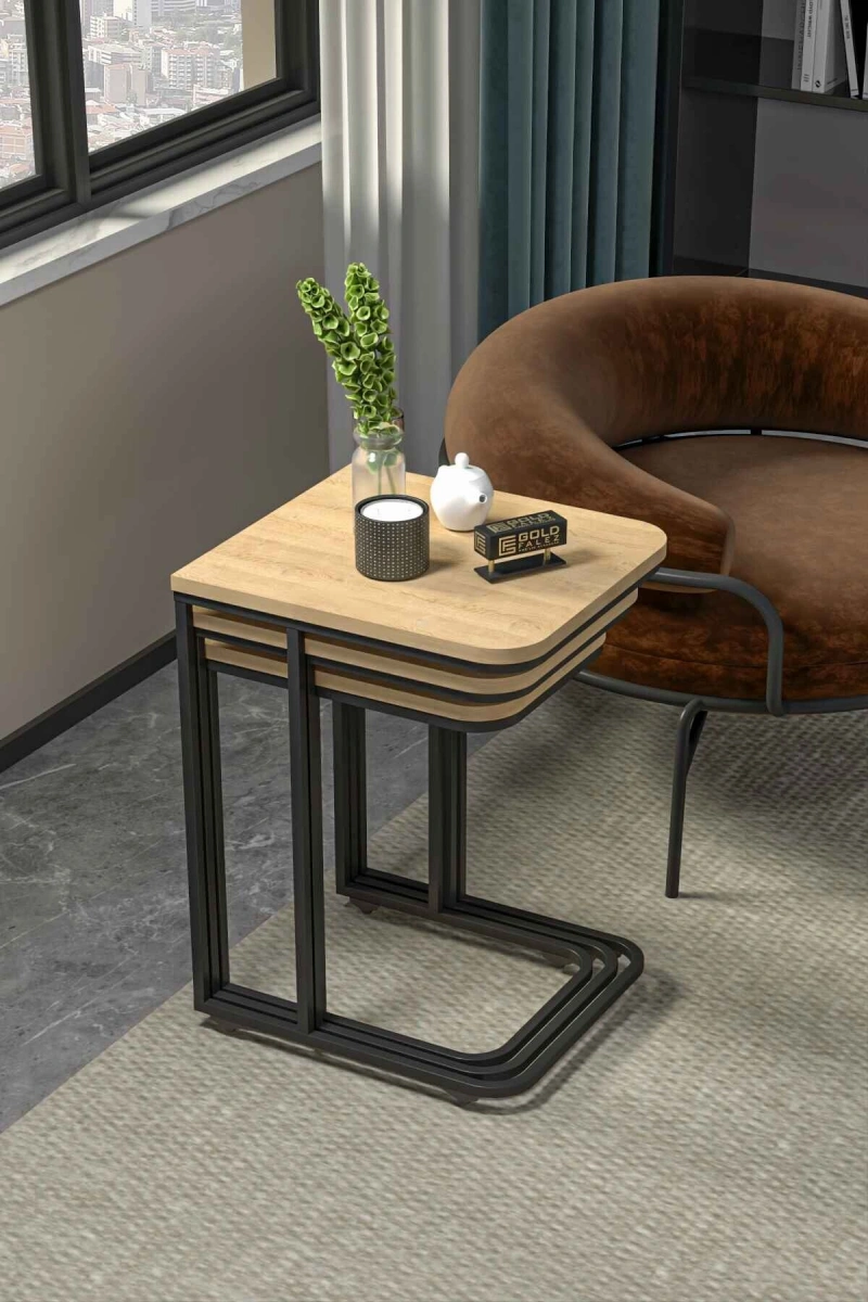 3’lü Modern Yan Sehpa Seti – Metal Ayaklı & Suntalam Üst Tabla.