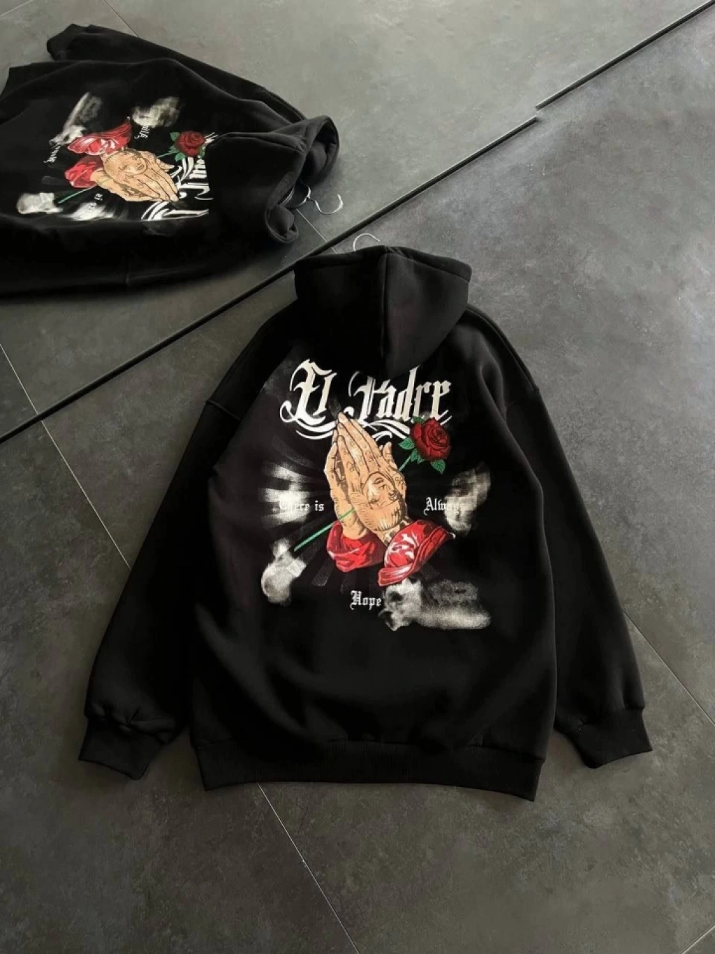 Üç İplik Penye Uzun Kol Kapşonlu Baskılı SweatShirt - Siyah