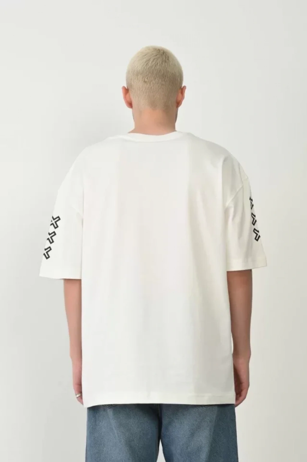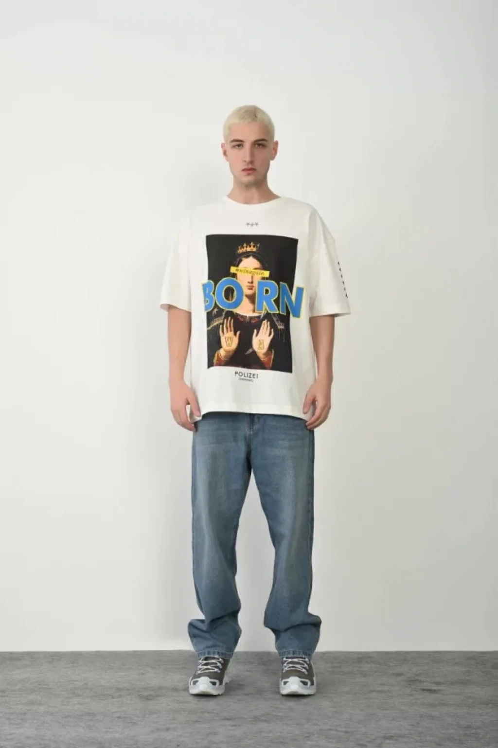 Unisex Baskılı Bisiklet Yaka Oversize T-Shirt - Beyaz