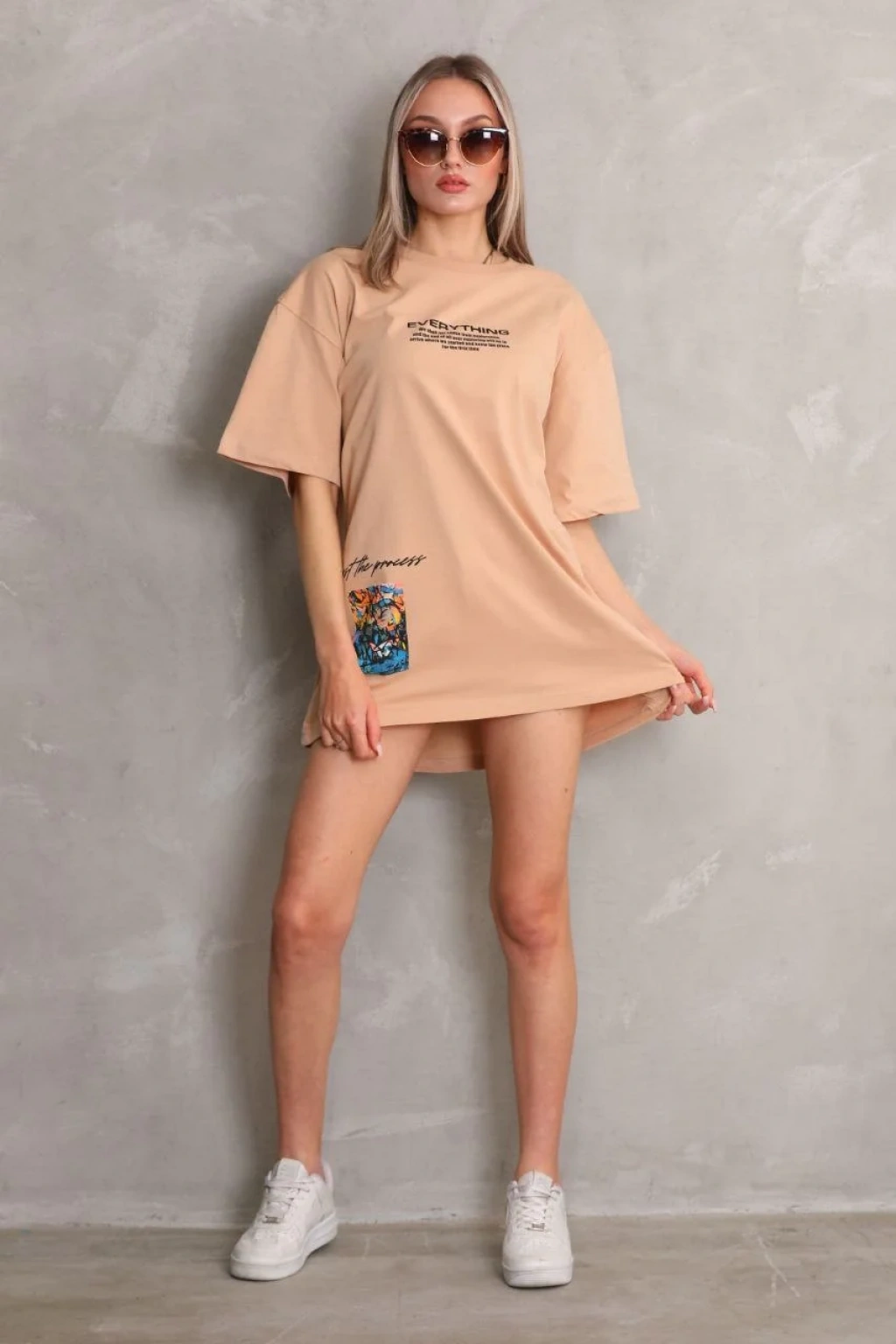 Unisex Bisiklet Yaka Baskılı Oversize T-Shirt - Bej