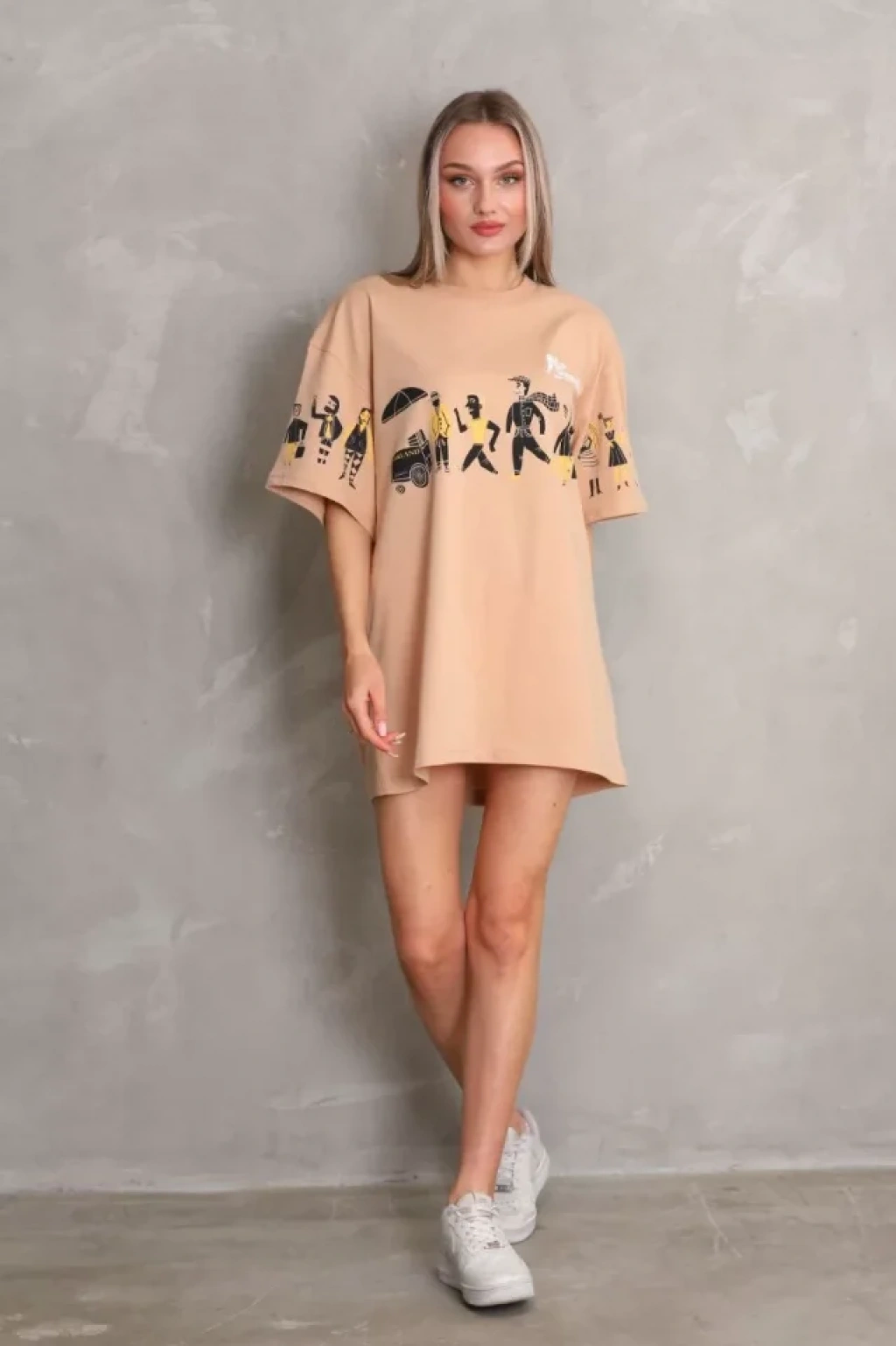 Unisex Bisiklet Yaka Baskılı Oversize T-Shirt - Bej