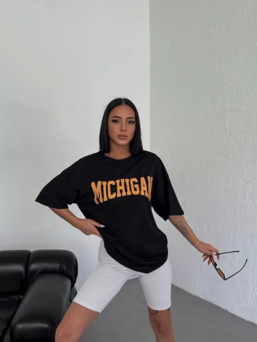 Unisex Bisiklet Yaka Baskılı Oversize T-Shirt - Beyaz