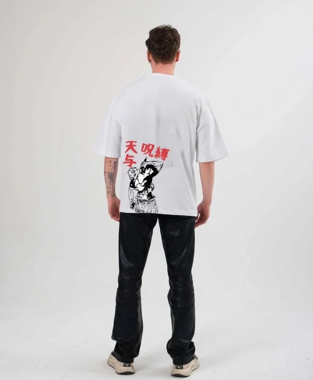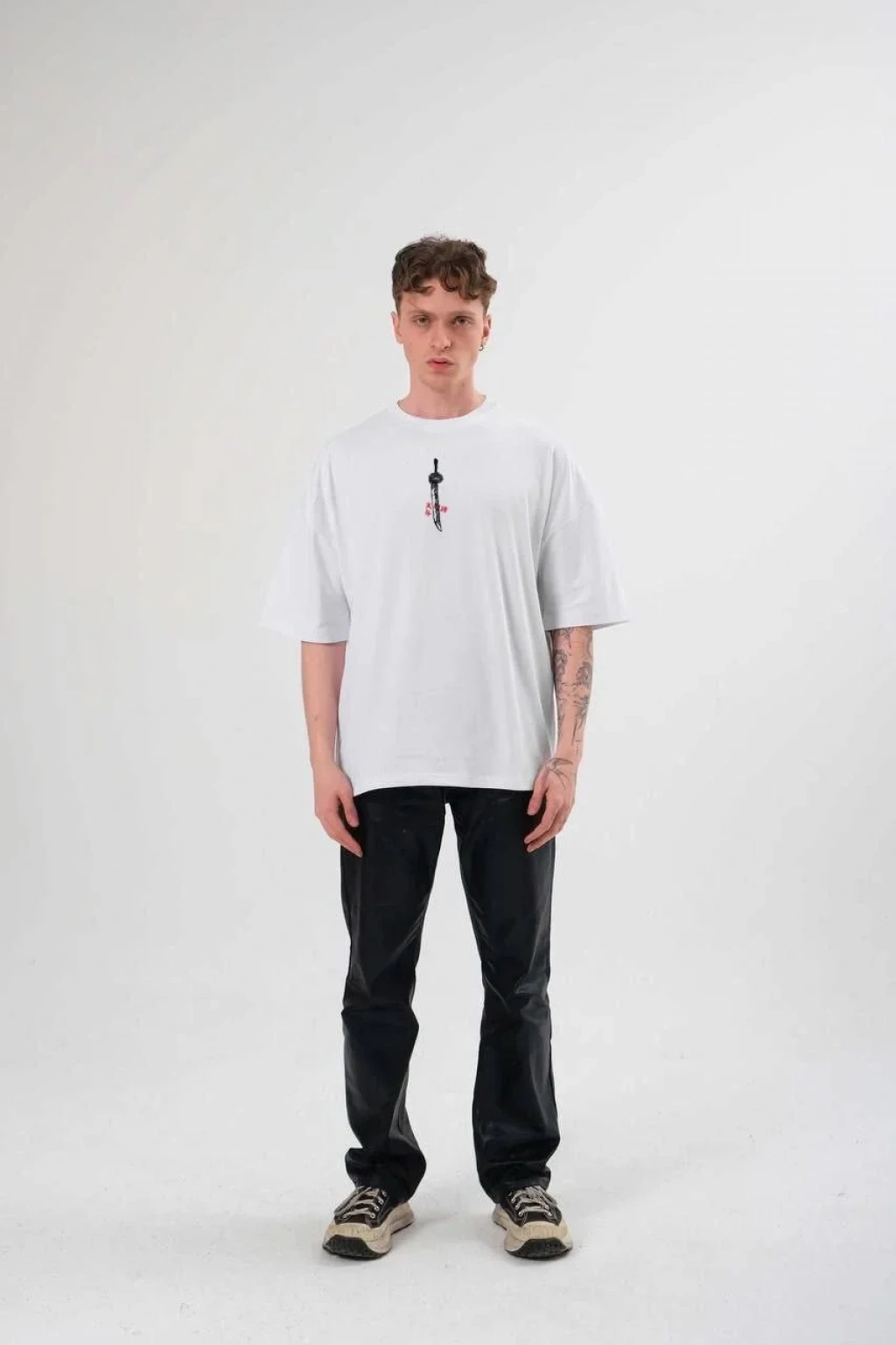 Unisex Bisiklet Yaka Baskılı Oversize T-Shirt - Beyaz