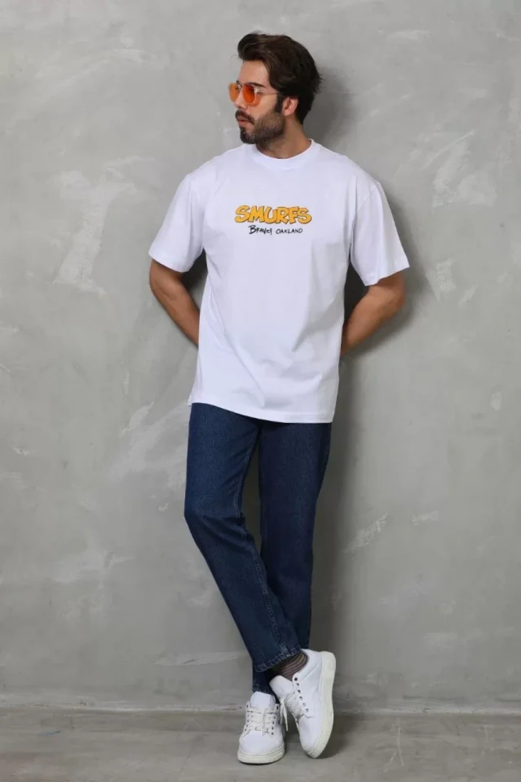 Unisex Bisiklet Yaka Baskılı Oversize T-Shirt - Beyaz