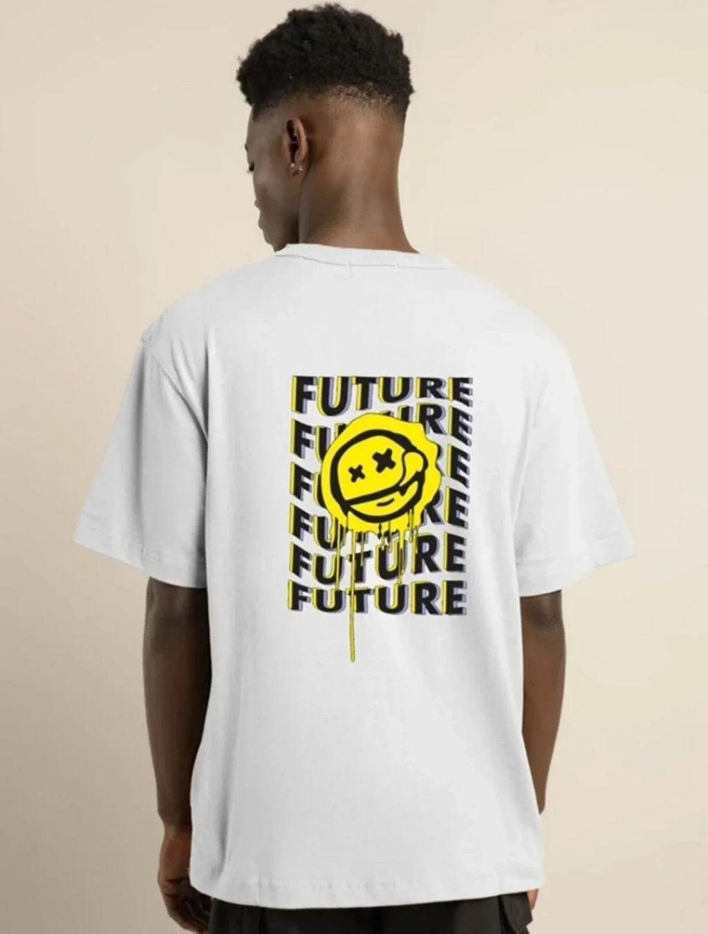 Unisex Bisiklet Yaka Baskılı Oversize T-Shirt - Beyaz