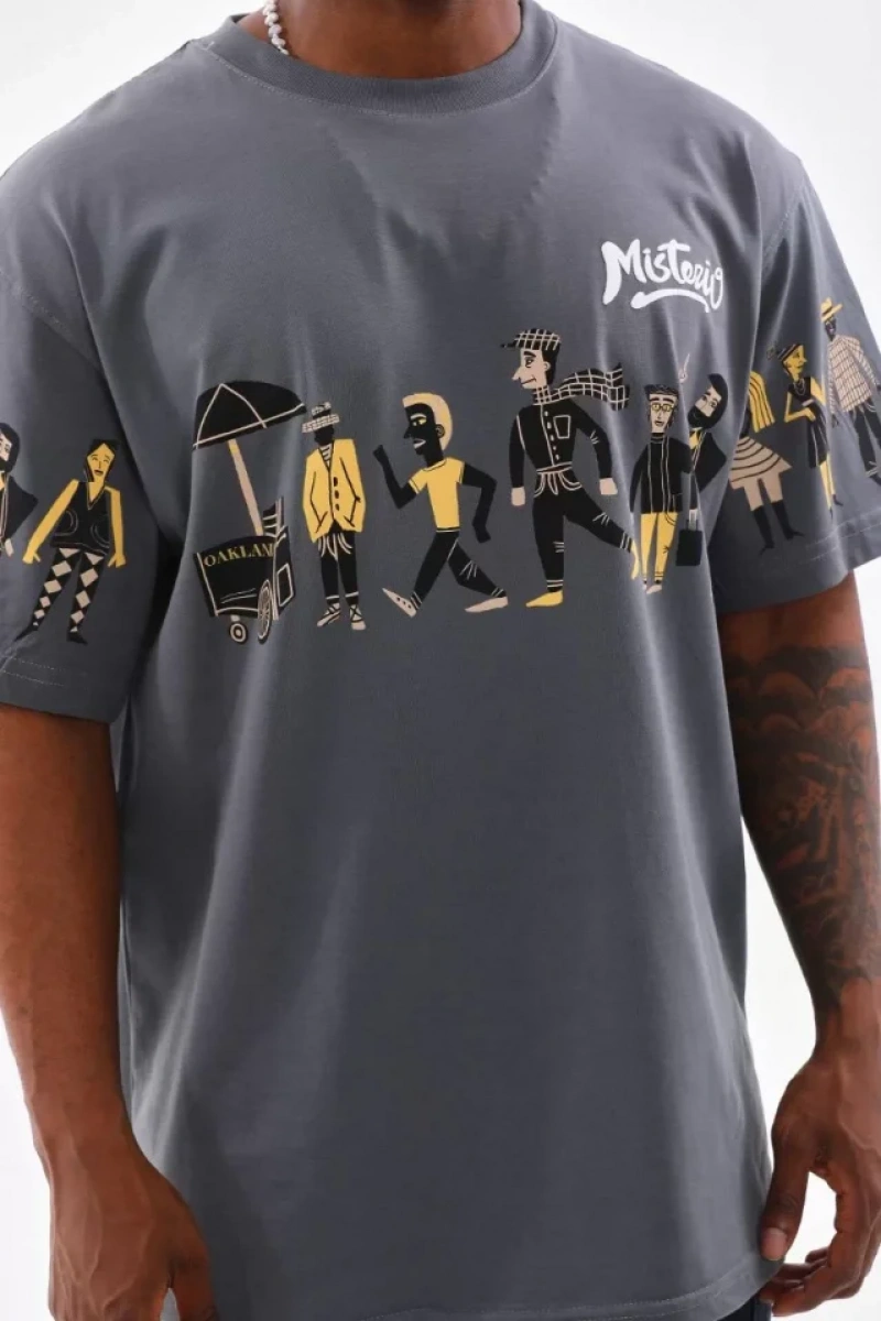 Unisex Bisiklet Yaka Baskılı Oversize T-Shirt - Gri