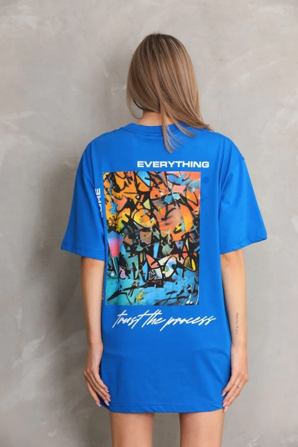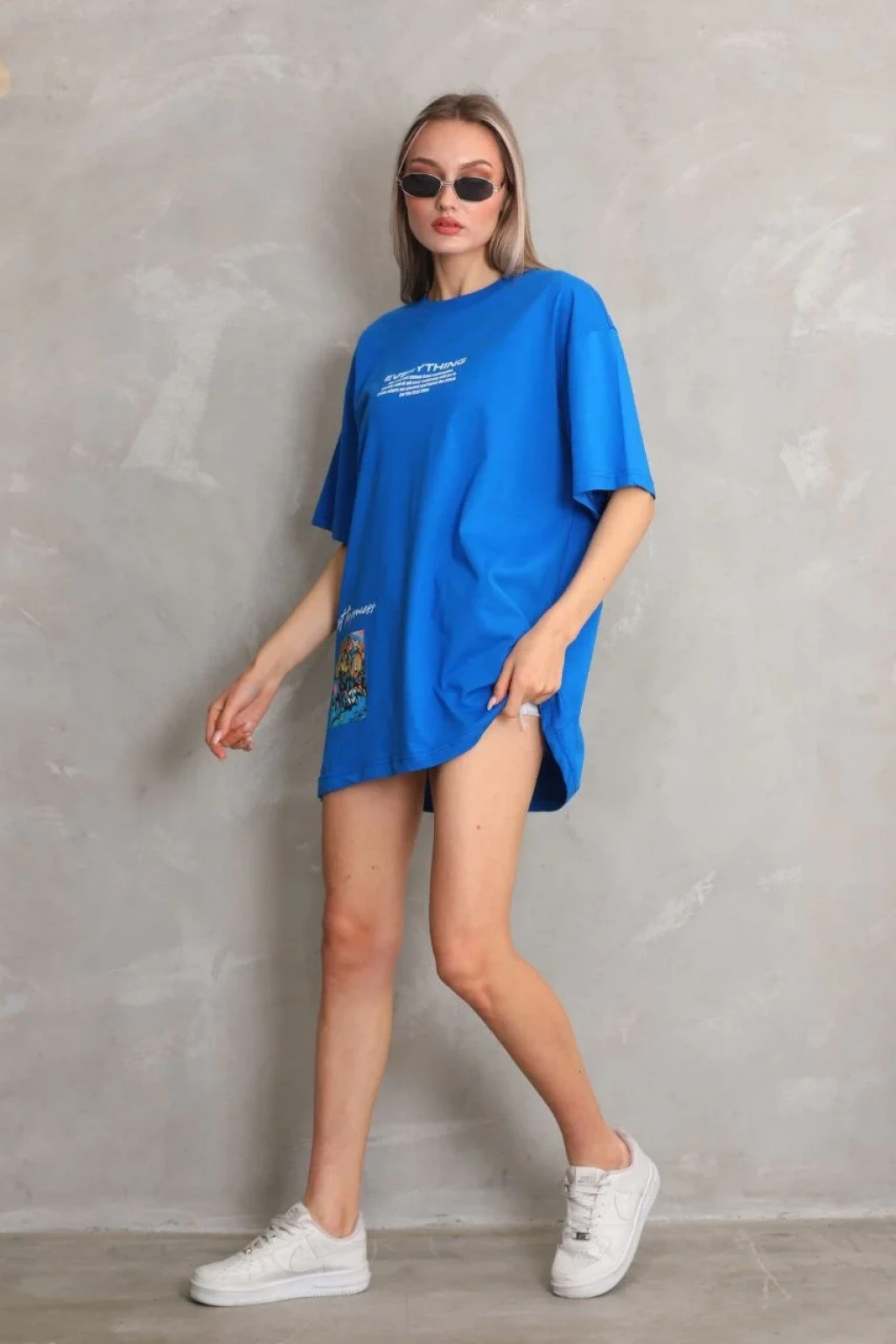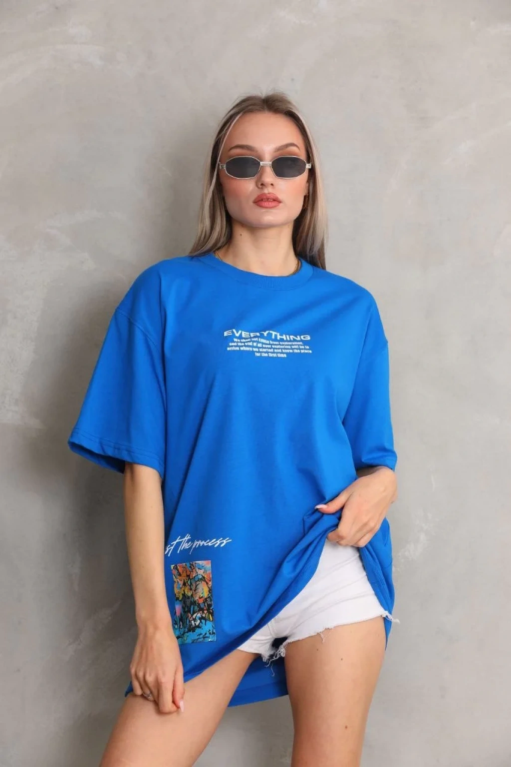 Unisex Bisiklet Yaka Baskılı Oversize T-Shirt - Mavi