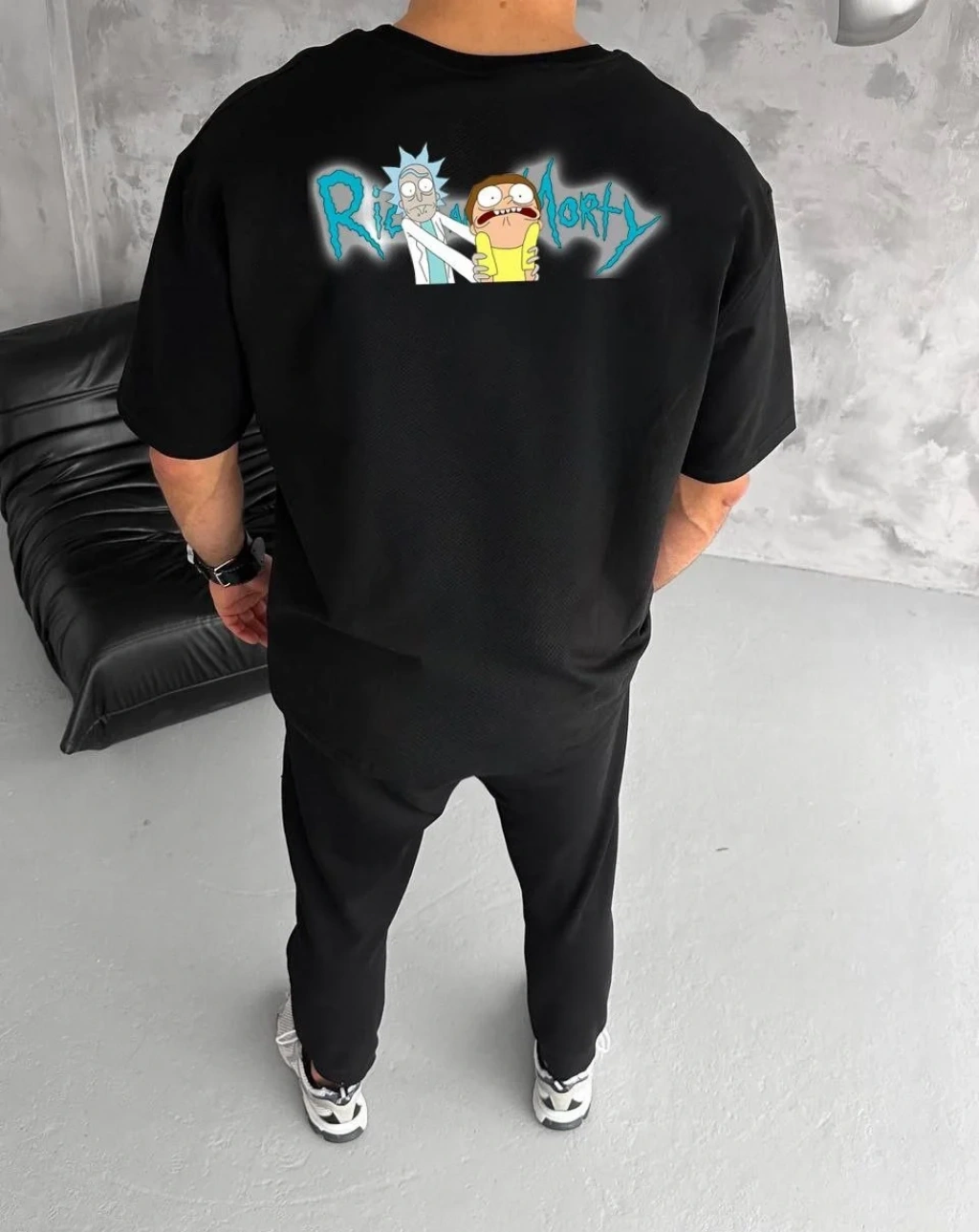 Unisex Bisiklet Yaka Baskılı Oversize T-Shirt - Siyah