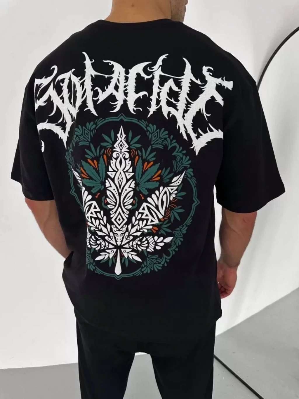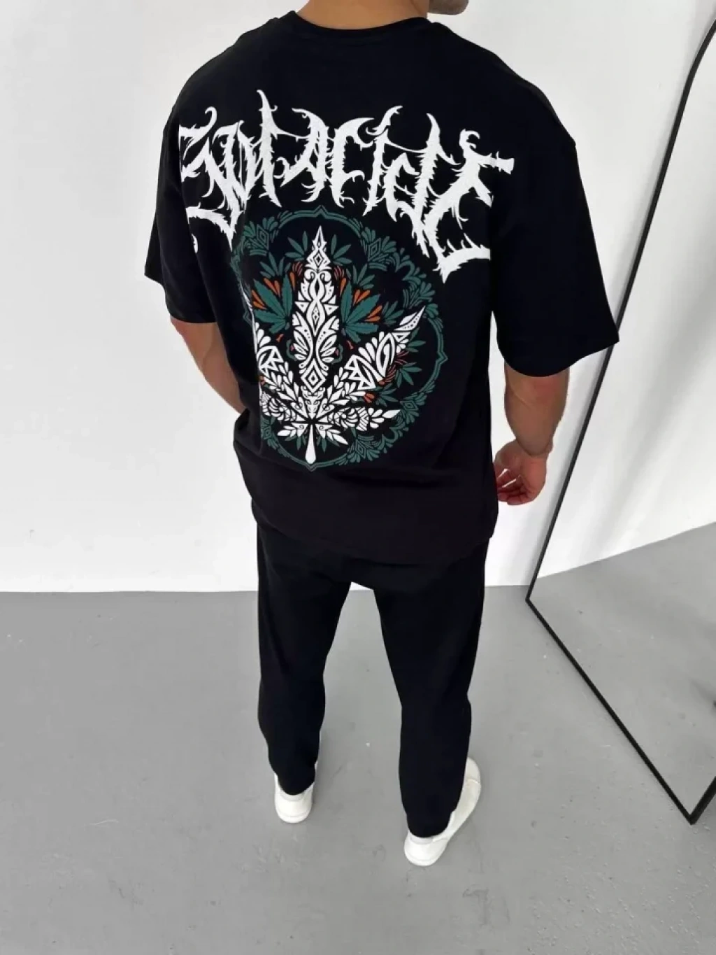 Unisex Bisiklet Yaka Baskılı Oversize T-Shirt - Siyah