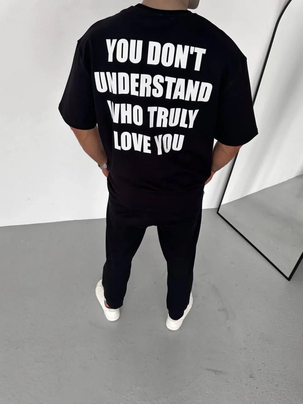 Unisex Bisiklet Yaka Baskılı Oversize T-Shirt - Siyah