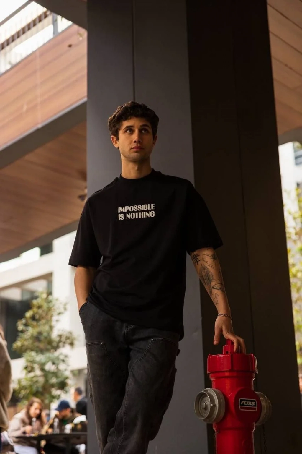 Unisex Bisiklet Yaka Baskılı Oversize T-Shirt - Siyah
