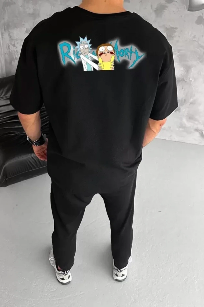 Unisex Bisiklet Yaka Baskılı Oversize T-Shirt - Siyah