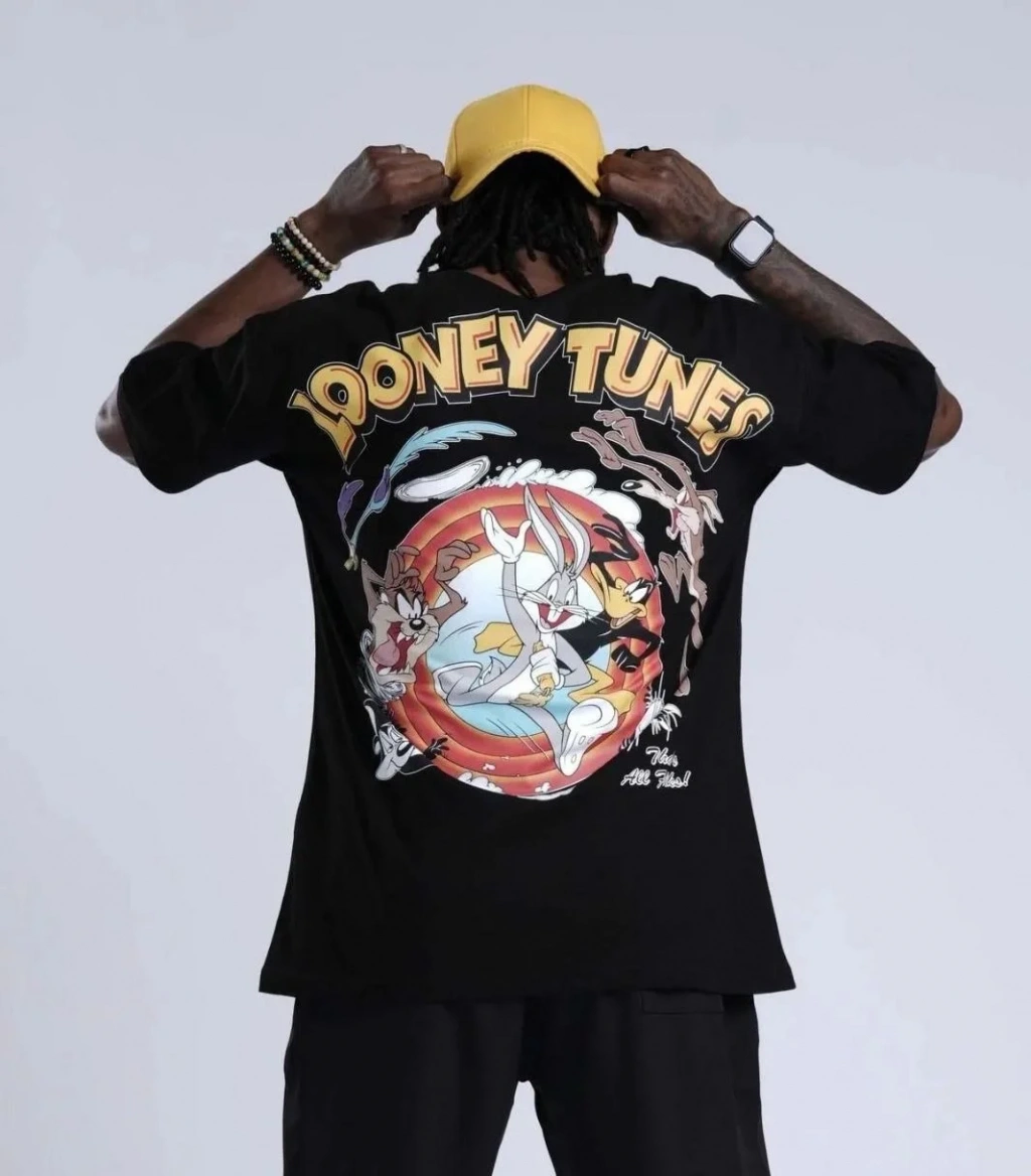 Unisex Bisiklet Yaka Baskılı Oversize T-Shirt - Siyah