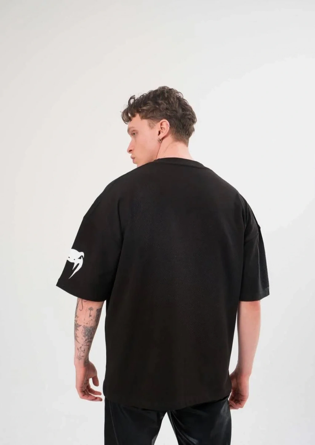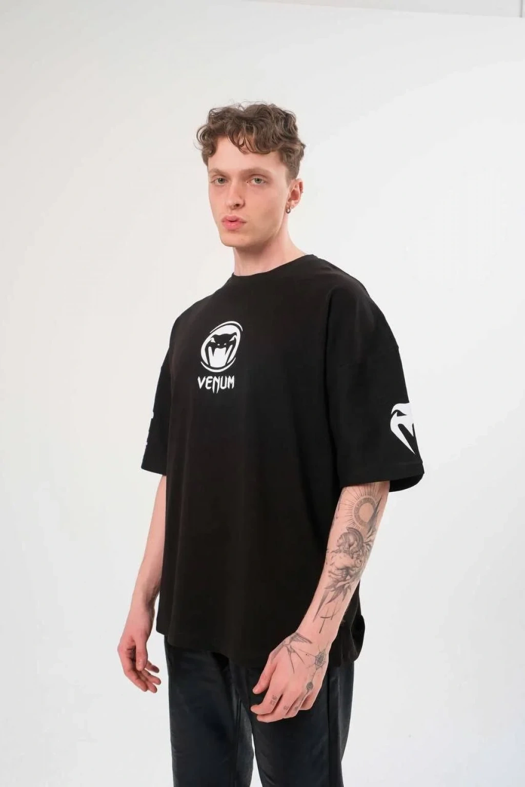 Unisex Bisiklet Yaka Baskılı Oversize T-Shirt - Siyah