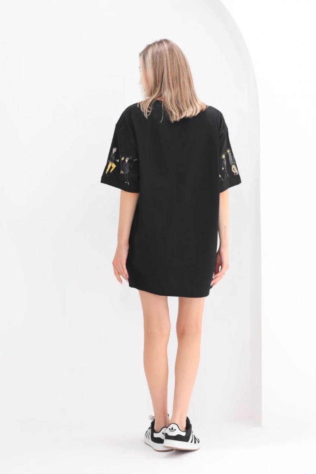 Unisex Bisiklet Yaka Baskılı Oversize T-Shirt - Siyah