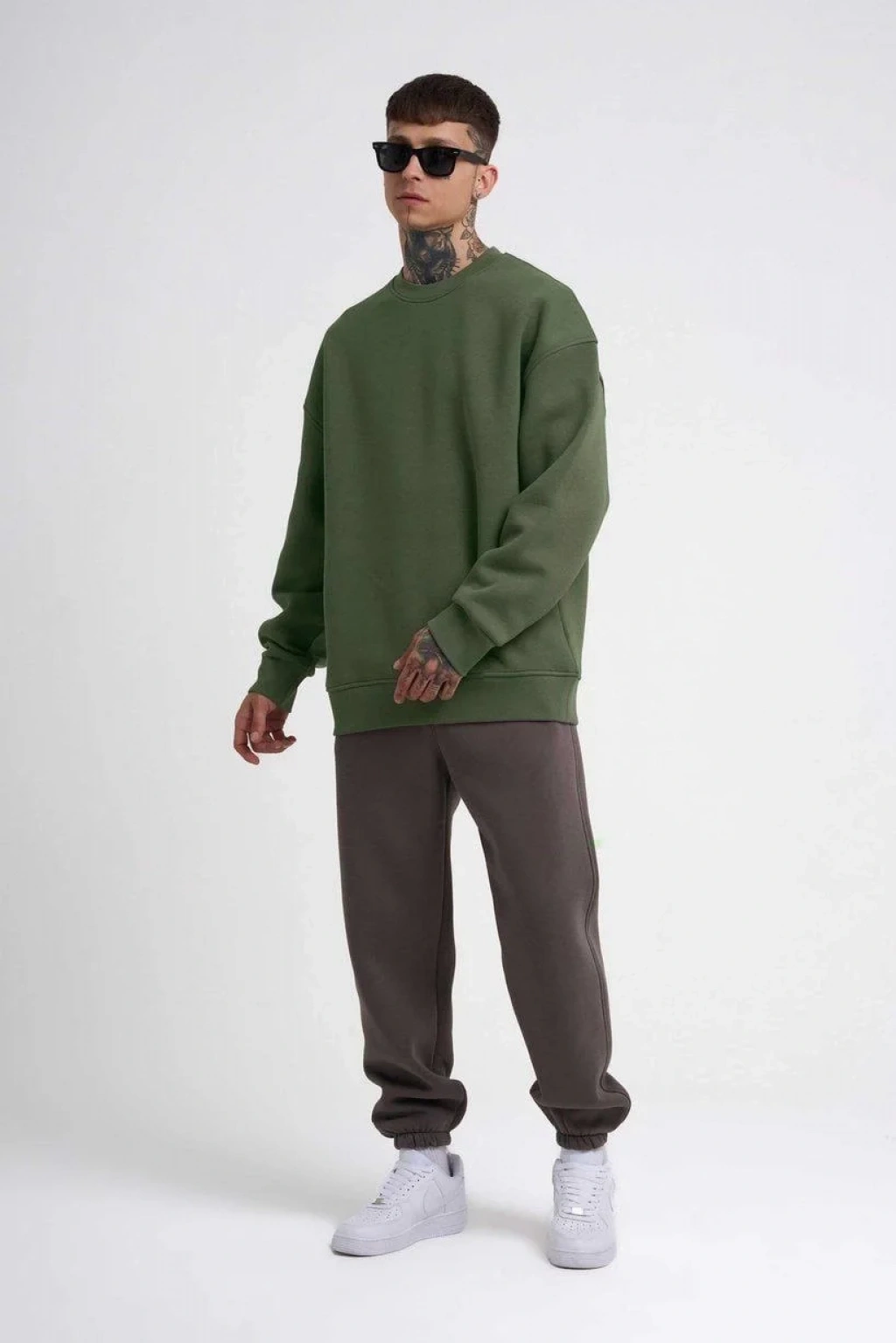 Unisex Biskilet Yaka Üç İplik SweatShirt - Haki