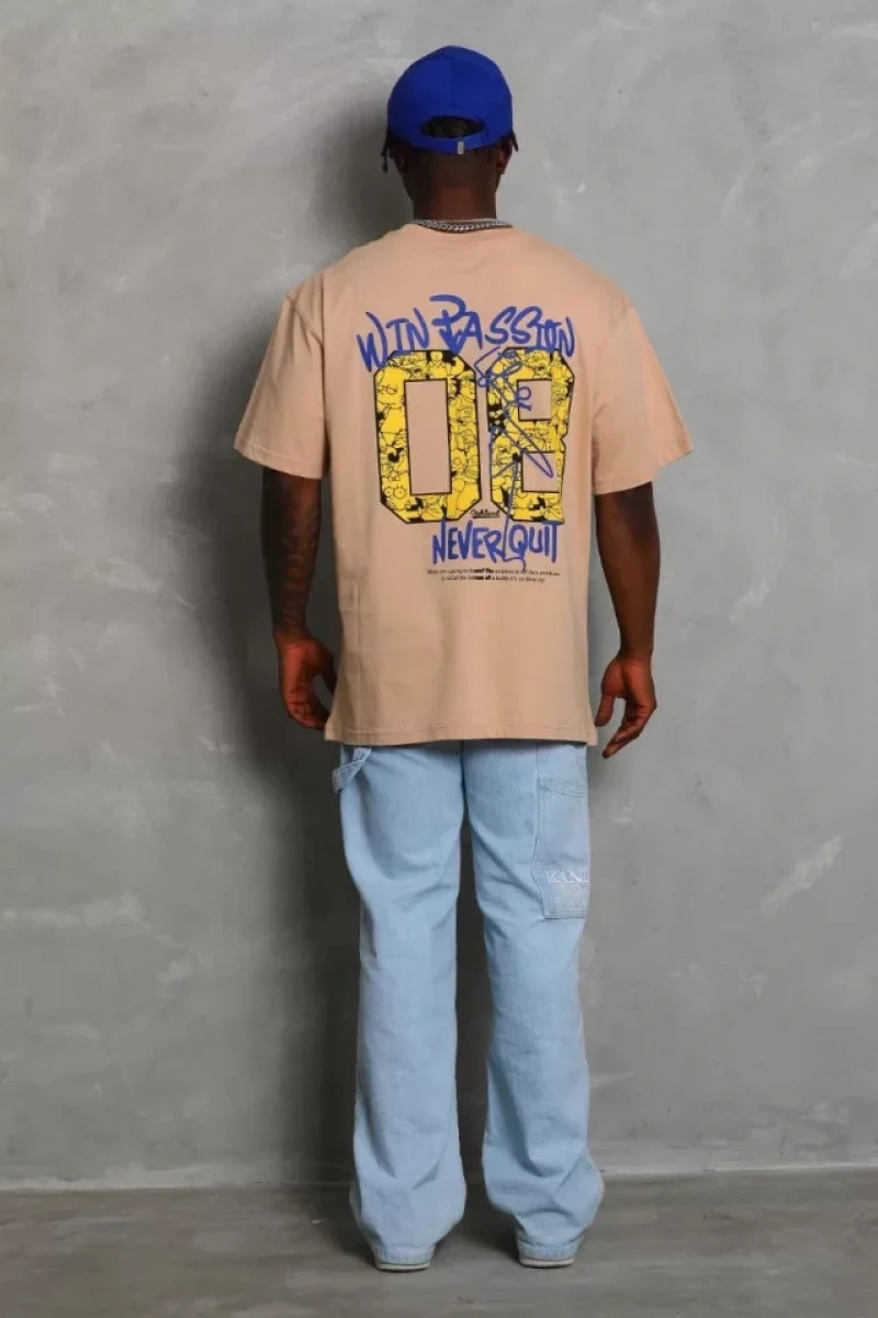 Unisex Oversize Baskılı Bisiklet Yaka T-Shirt - Bej