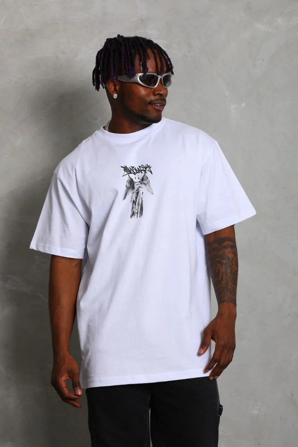Unisex Oversize Baskılı Bisiklet Yaka T-Shirt - Beyaz