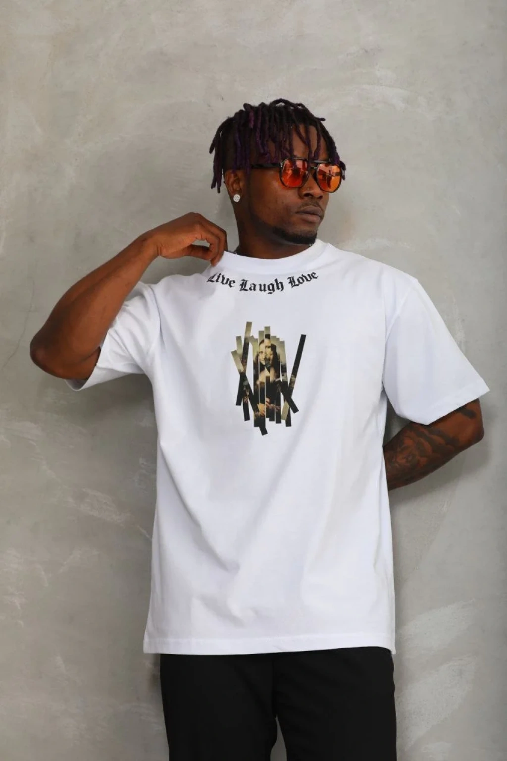 Unisex Oversize Baskılı Bisiklet Yaka T-Shirt - Beyaz