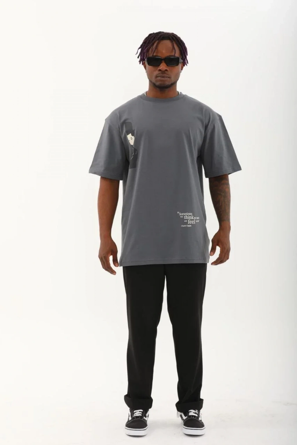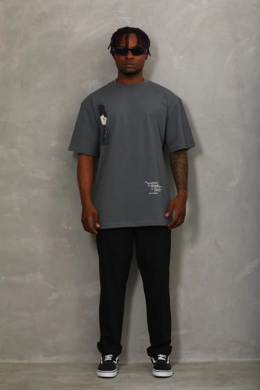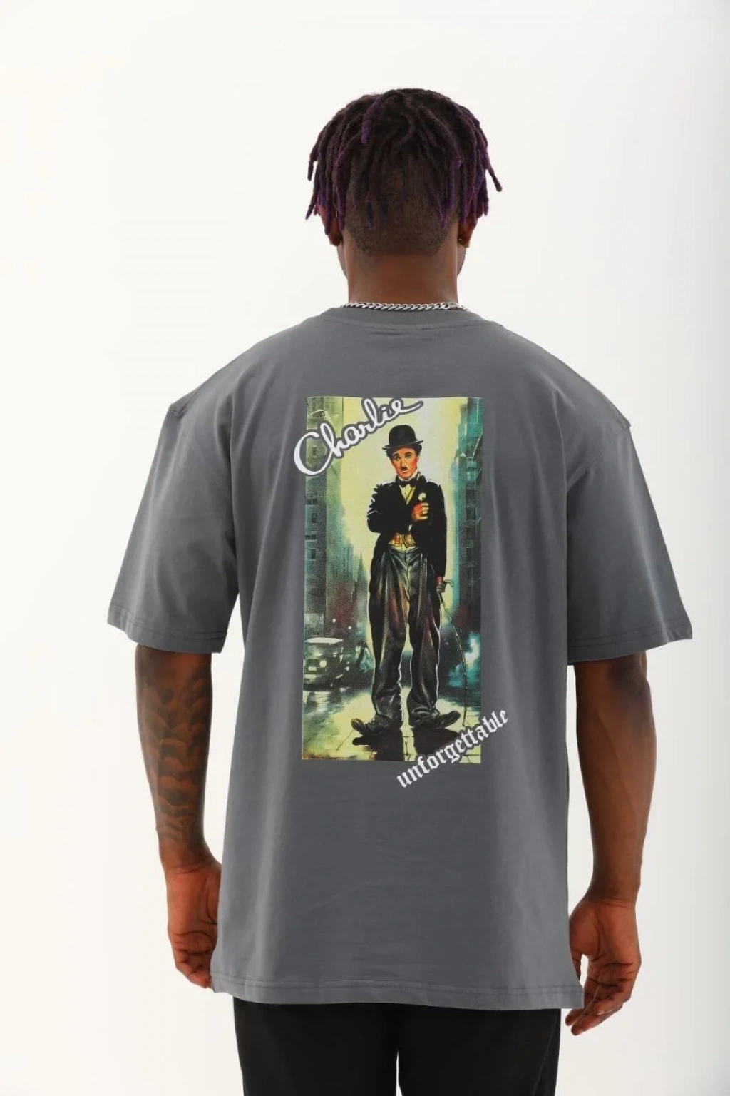Unisex Oversize Baskılı Bisiklet Yaka T-Shirt - Füme