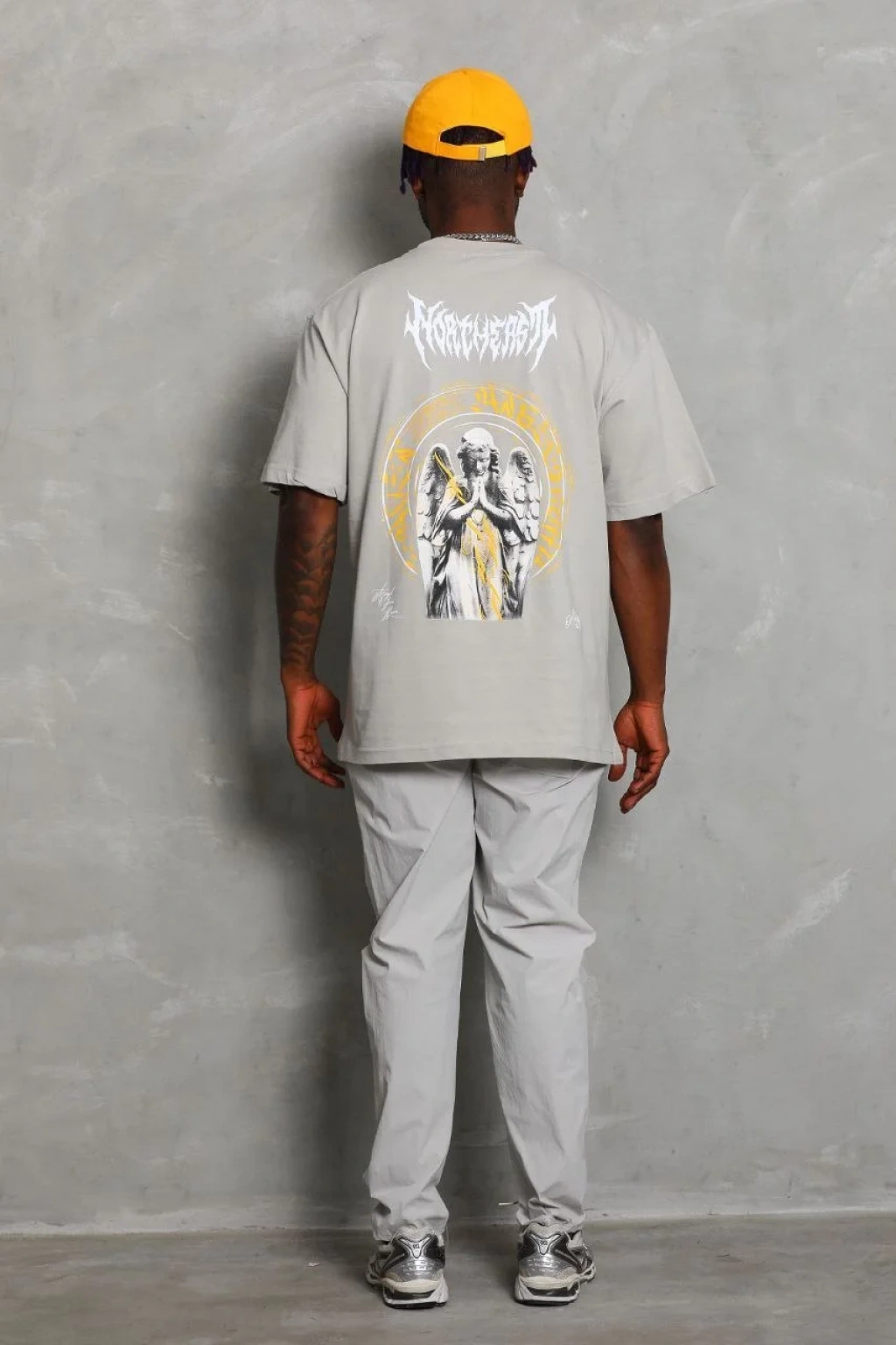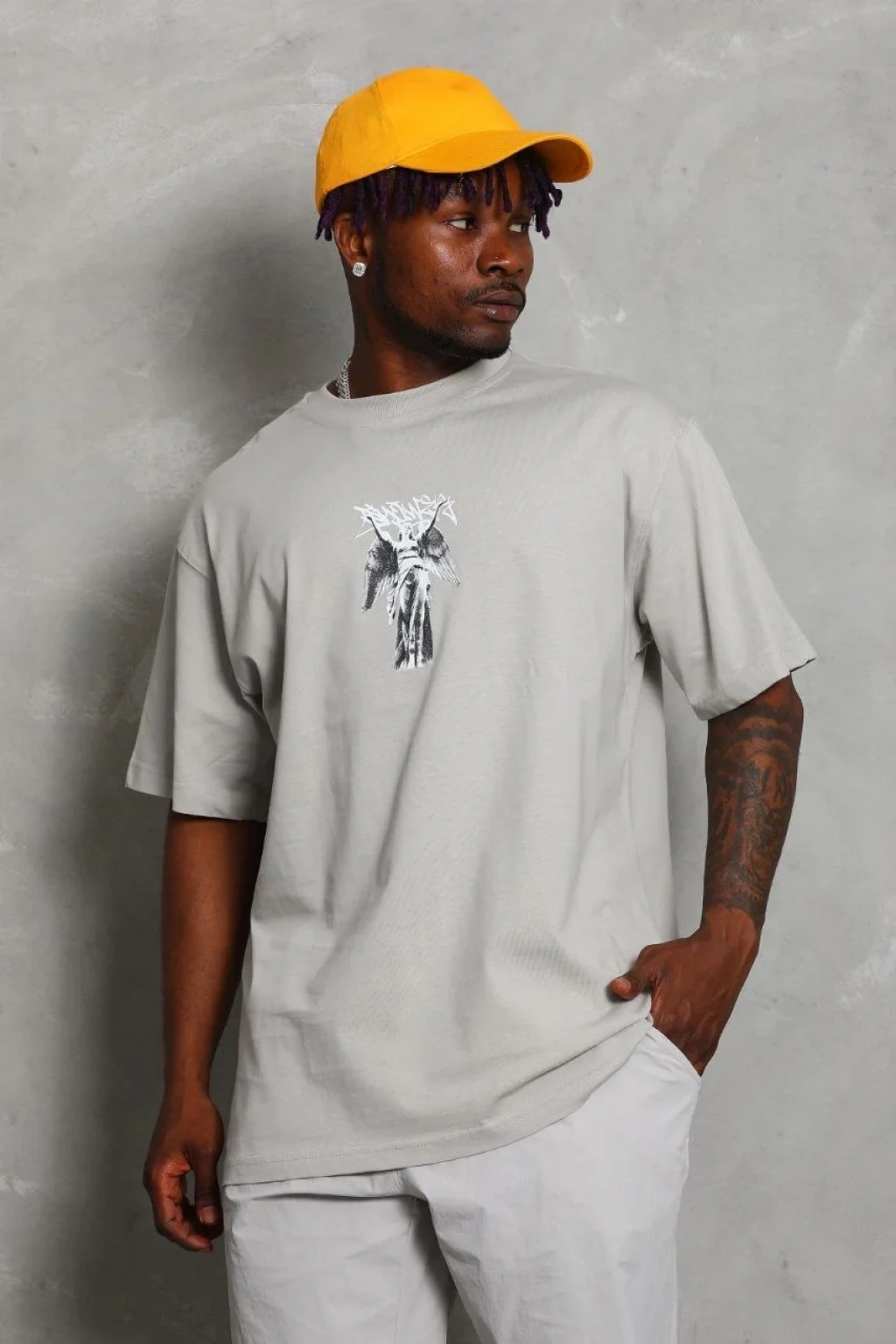 Unisex Oversize Baskılı Bisiklet Yaka T-Shirt - Gri