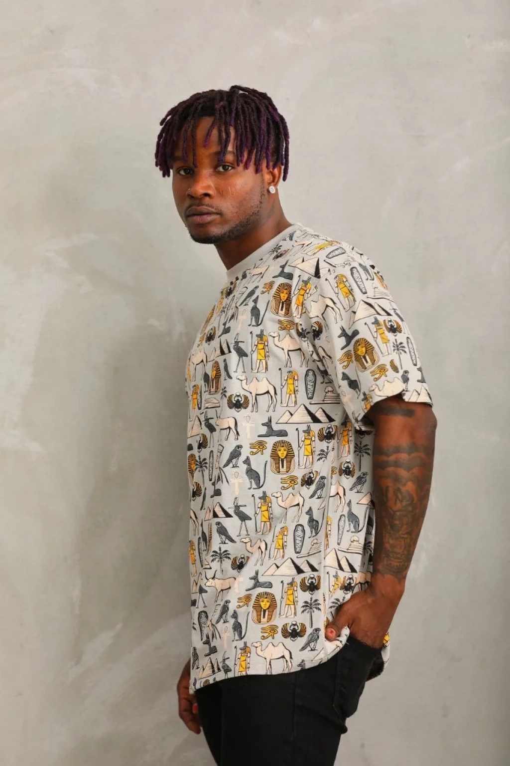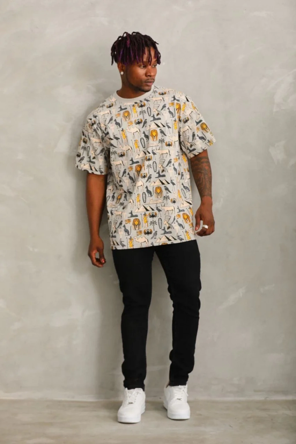 Unisex Oversize Baskılı Bisiklet Yaka T-Shirt - Gri