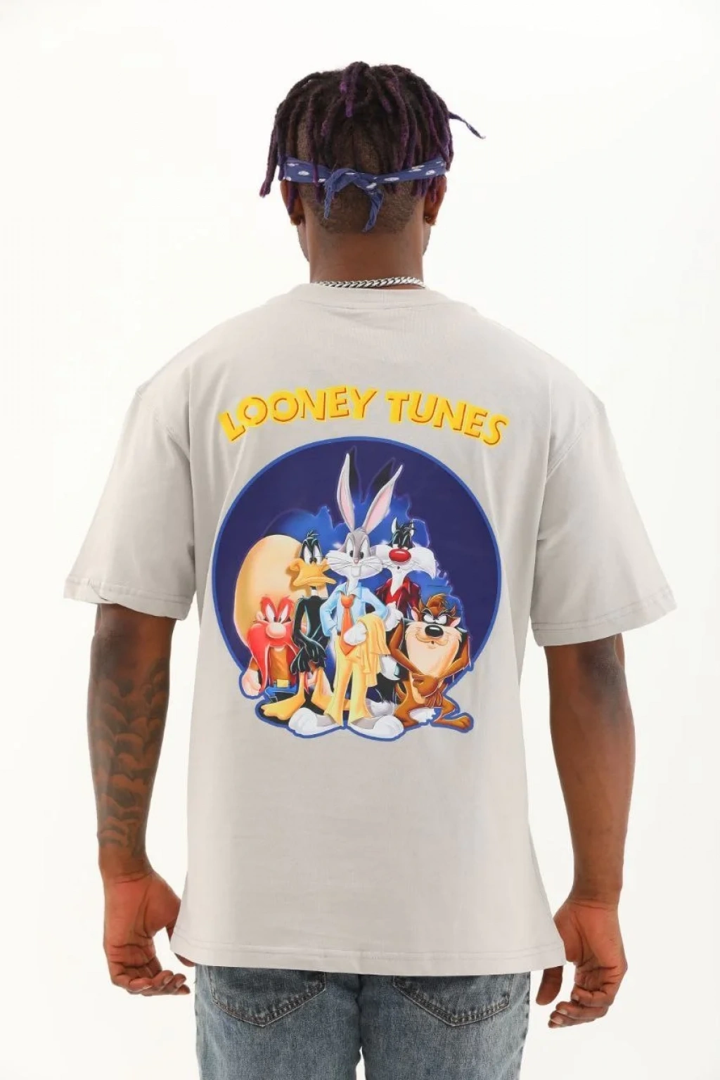 Unisex Oversize Baskılı Bisiklet Yaka T-Shirt - Gri