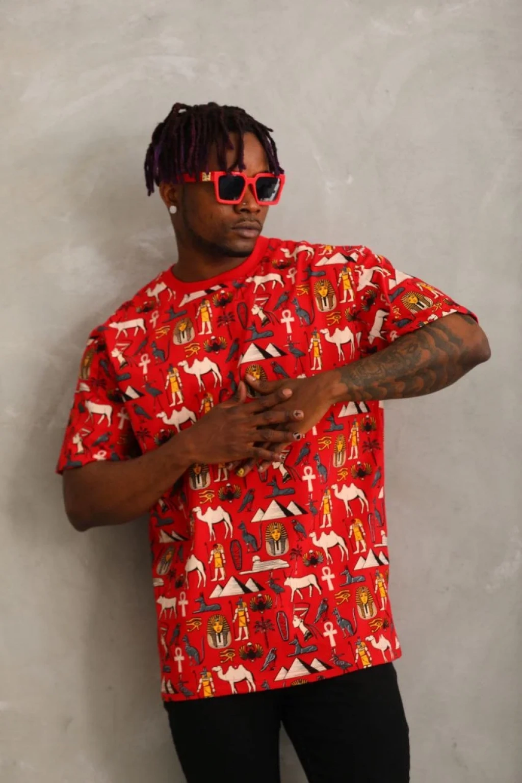 Unisex Oversize Baskılı Bisiklet Yaka T-Shirt - Kırmızı