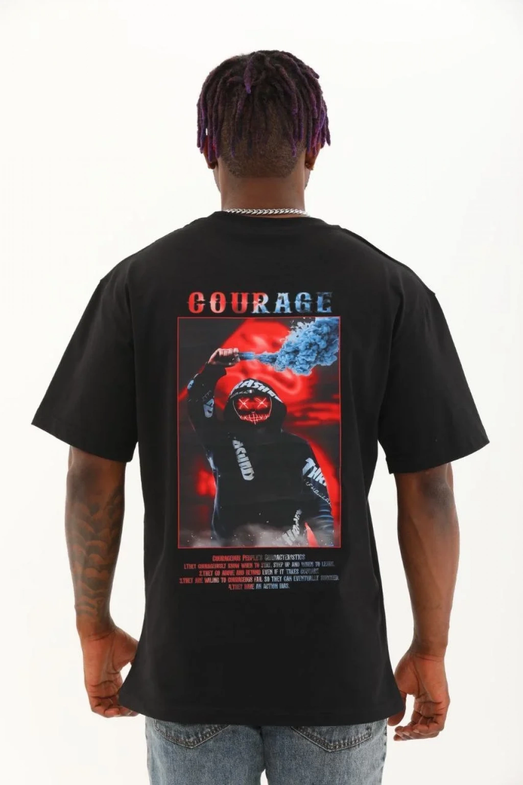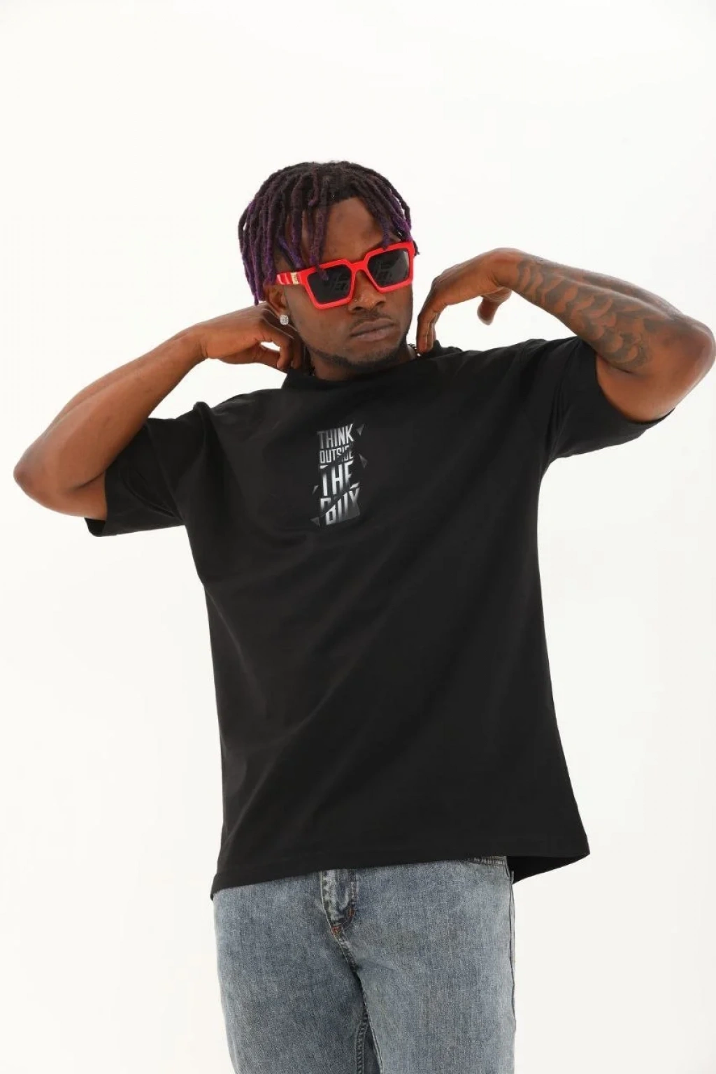 Unisex Oversize Baskılı Bisiklet Yaka T-Shirt - Siyah