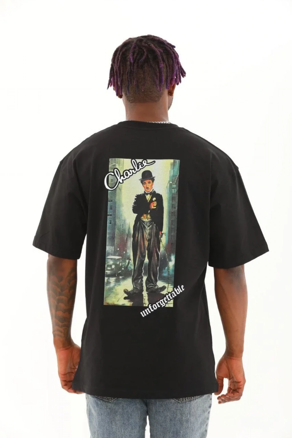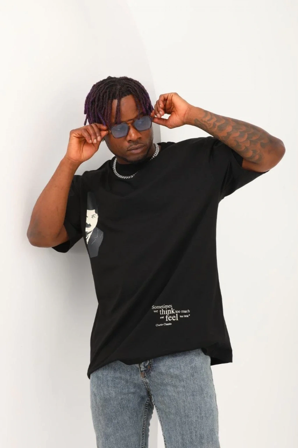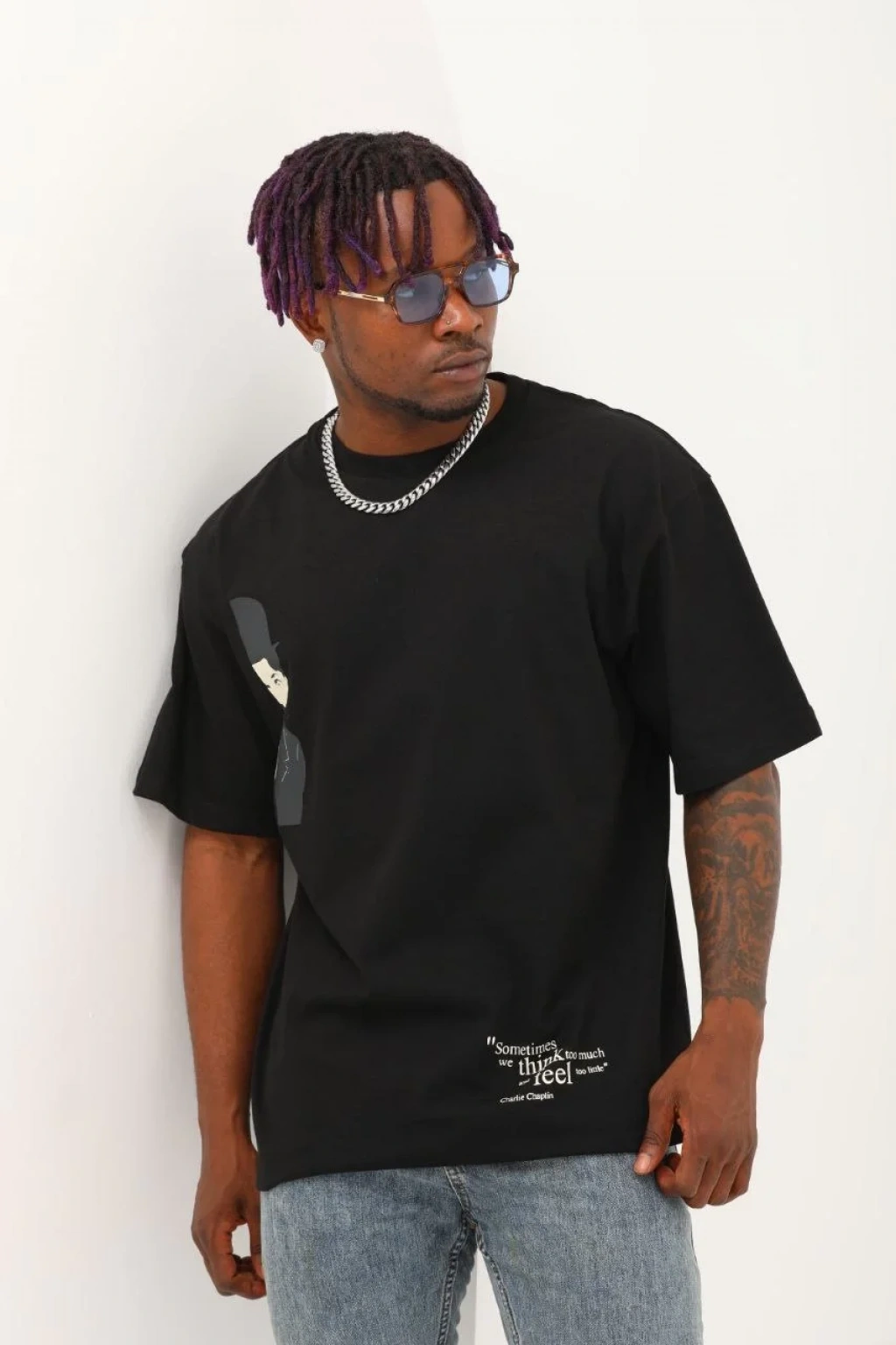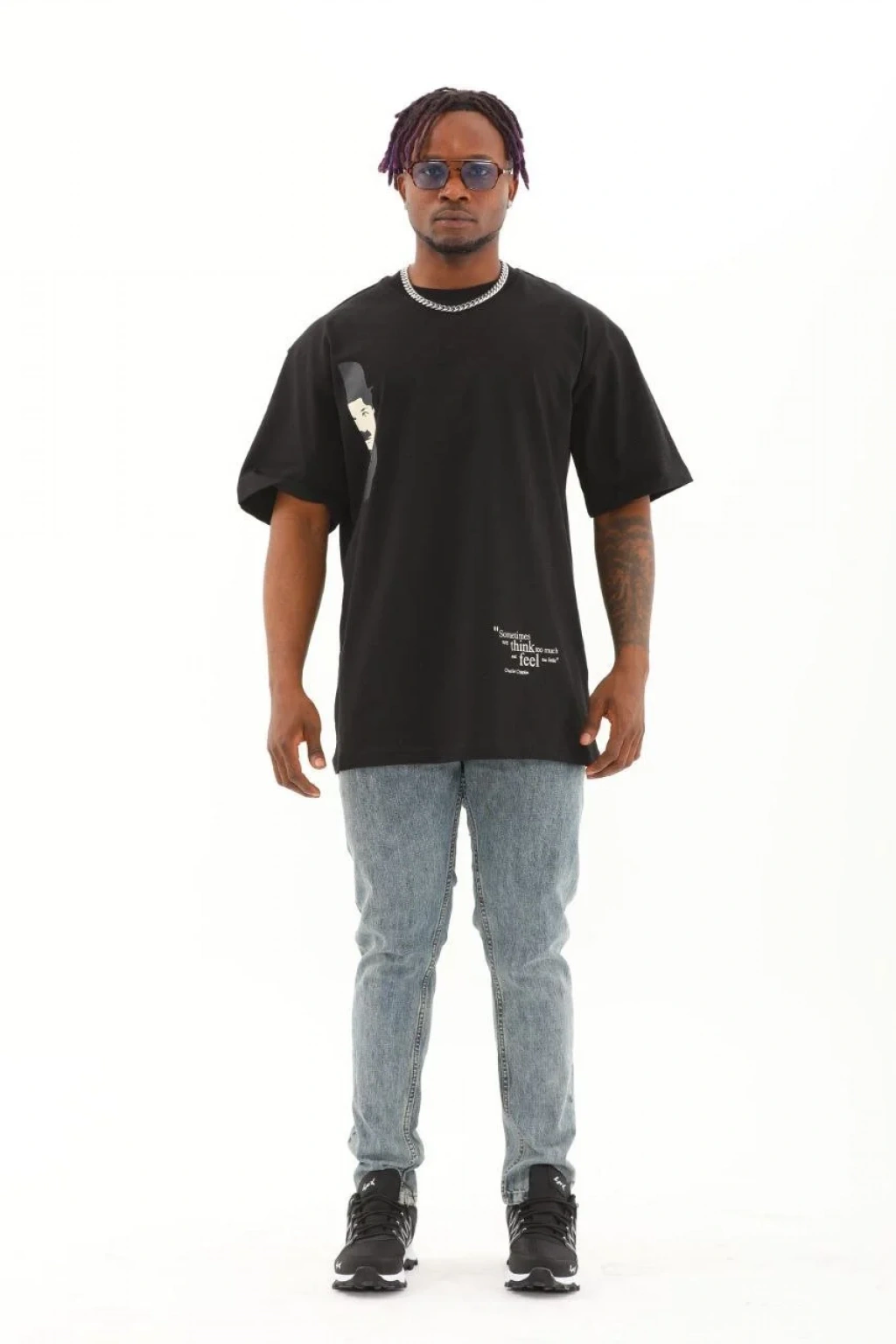 Unisex Oversize Baskılı Bisiklet Yaka T-Shirt - Siyah