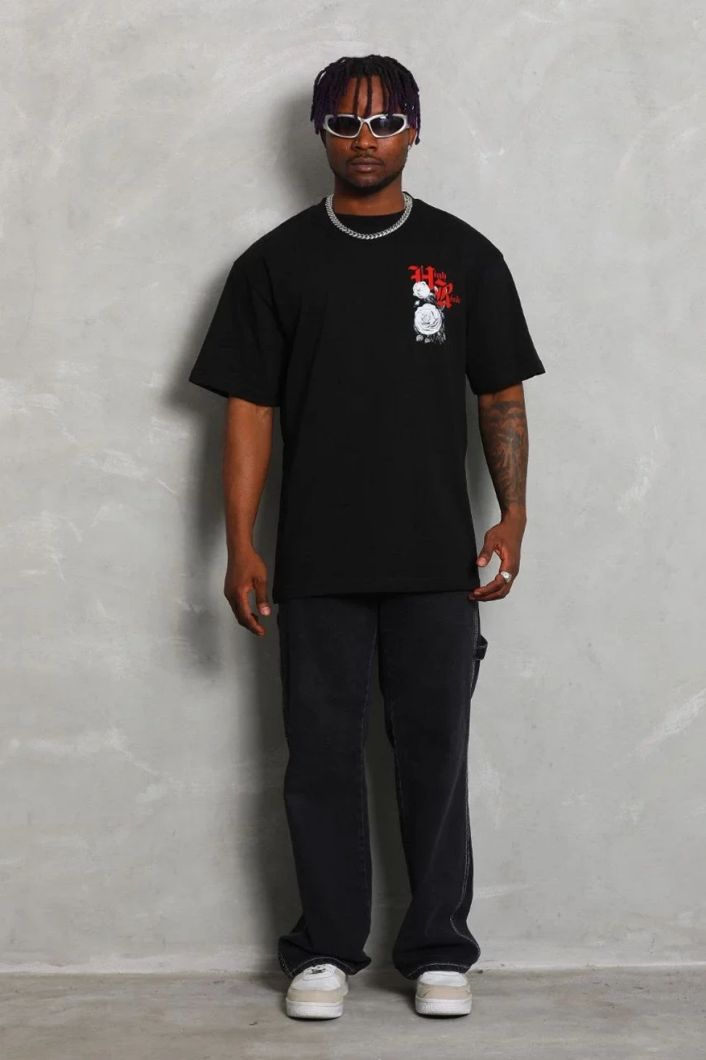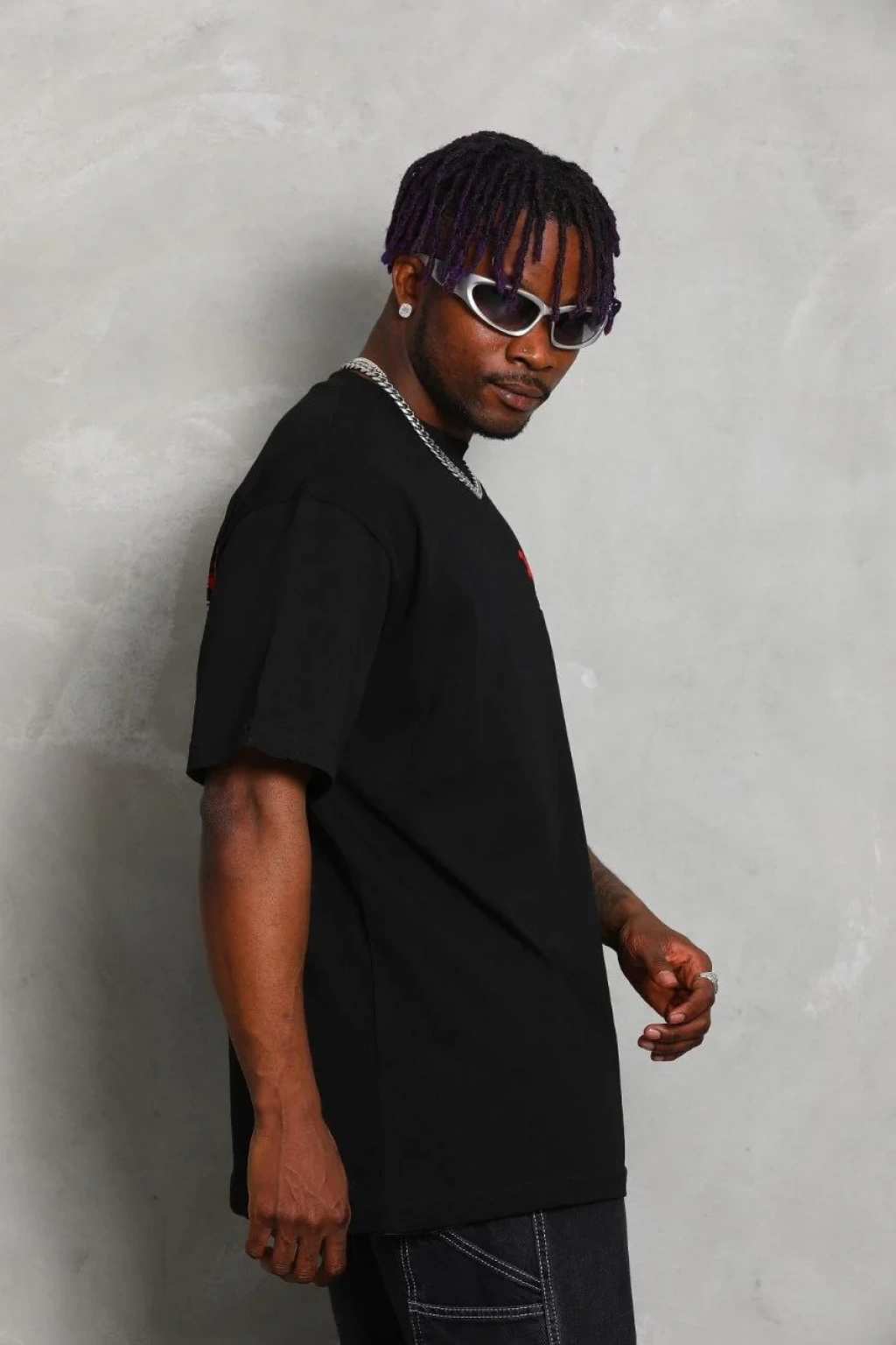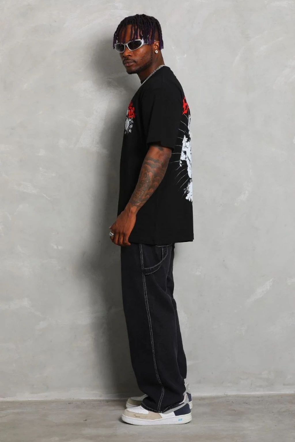 Unisex Oversize Baskılı Bisiklet Yaka T-Shirt - Siyah