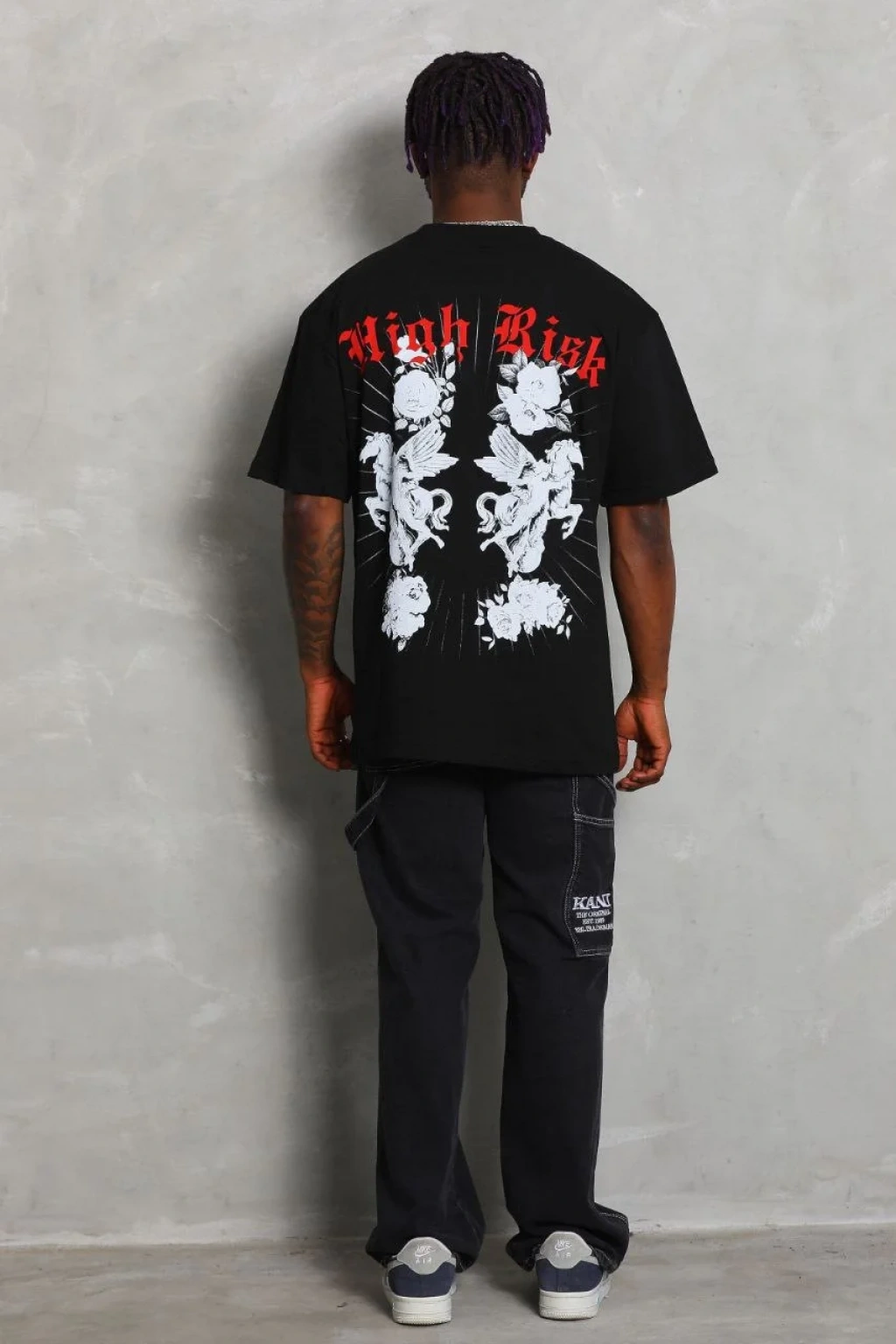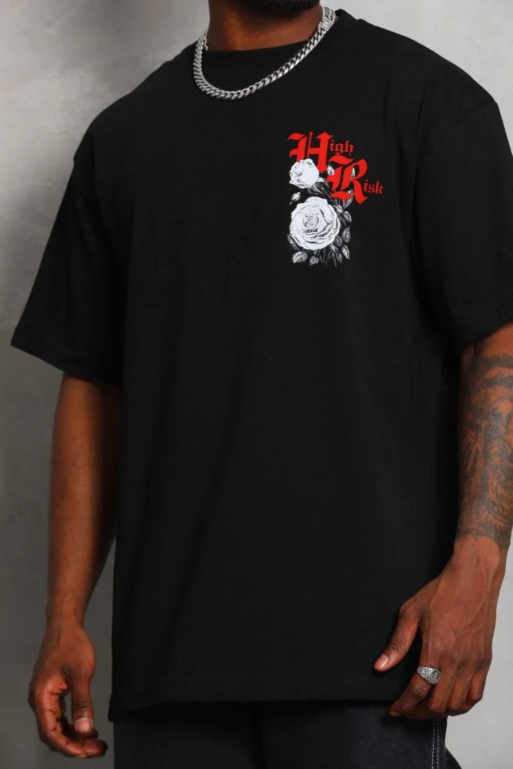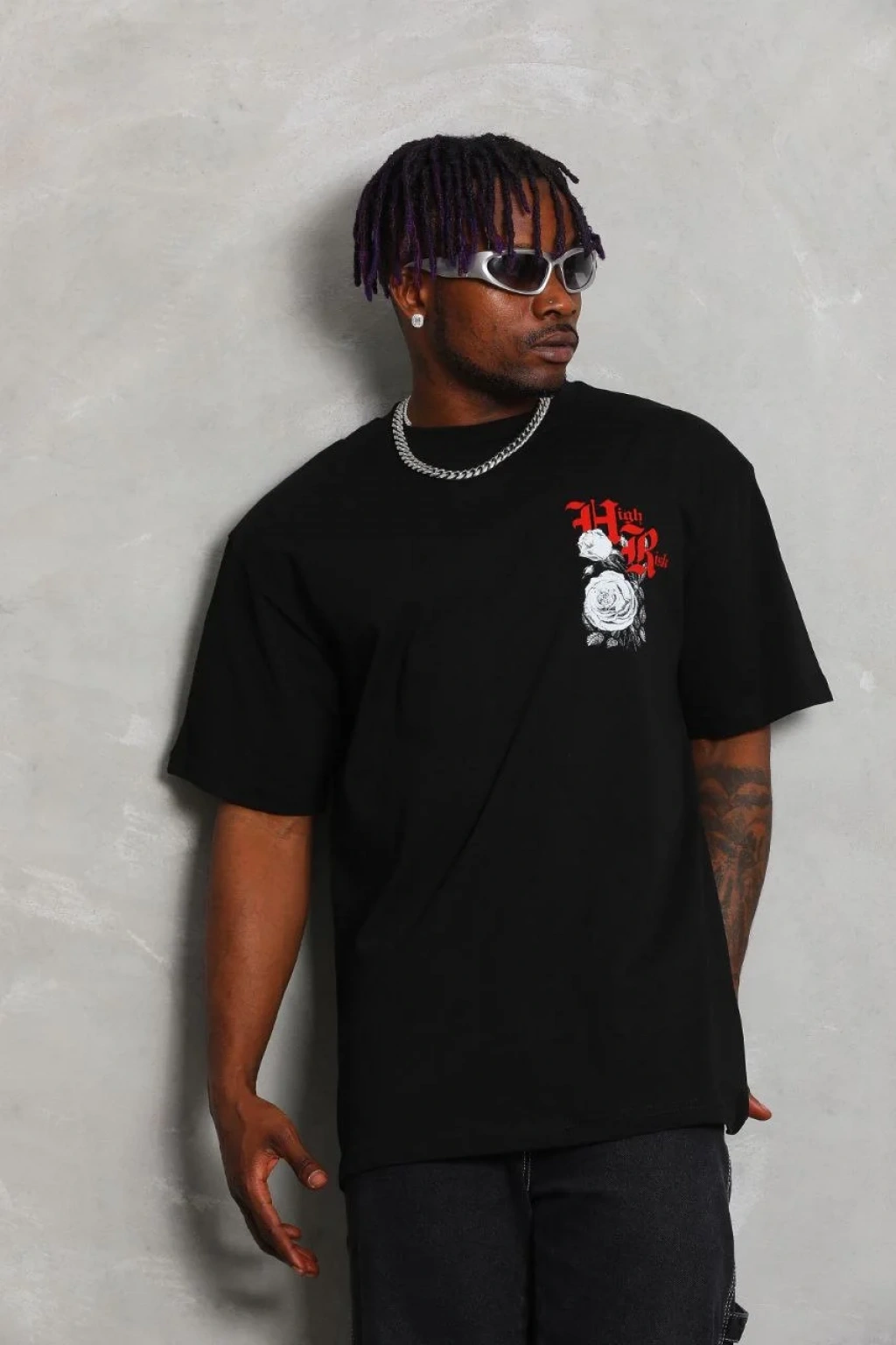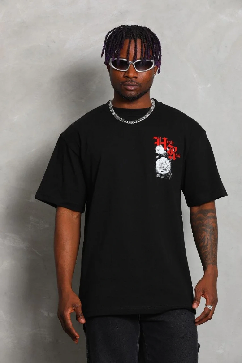 Unisex Oversize Baskılı Bisiklet Yaka T-Shirt - Siyah
