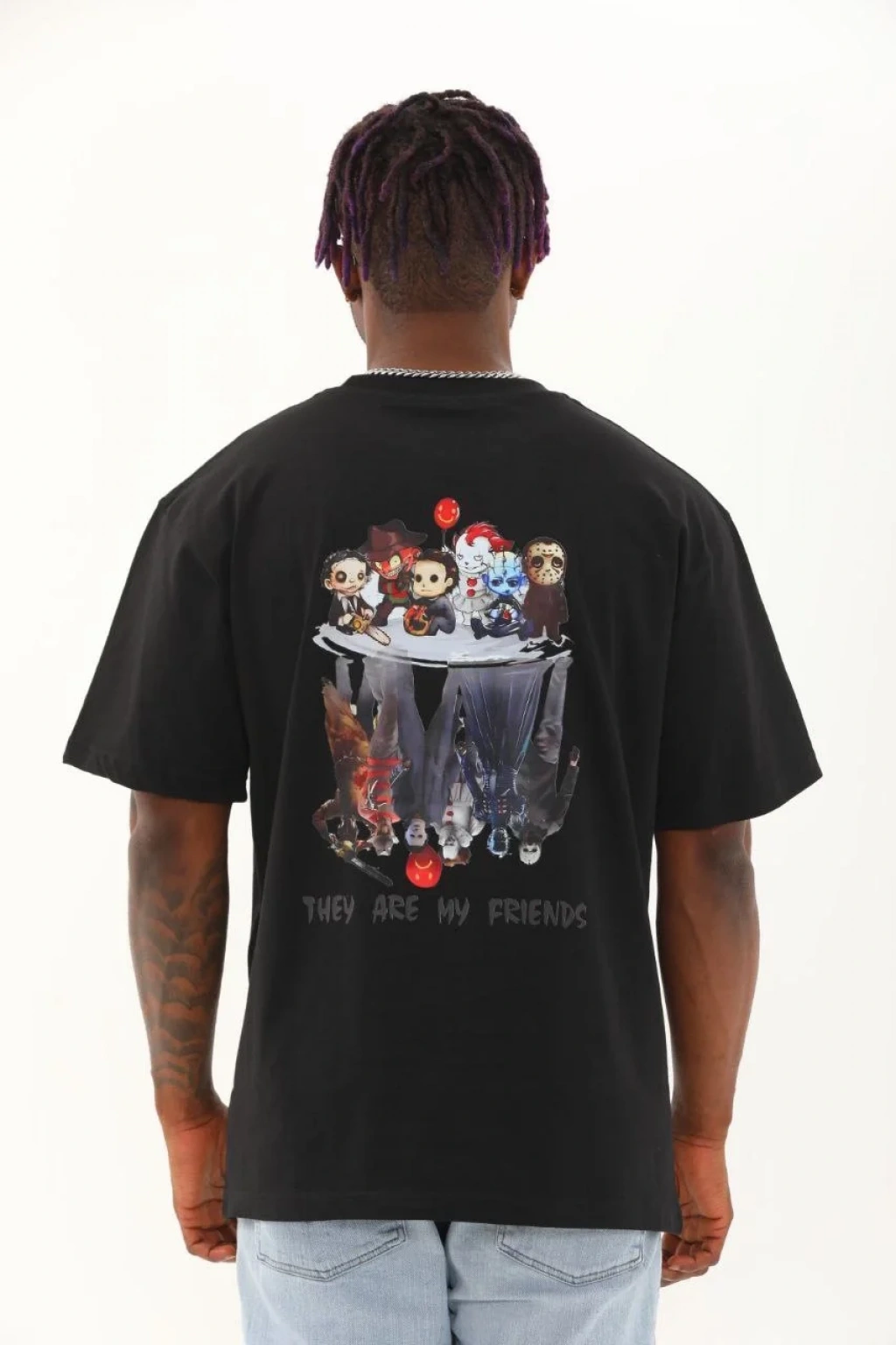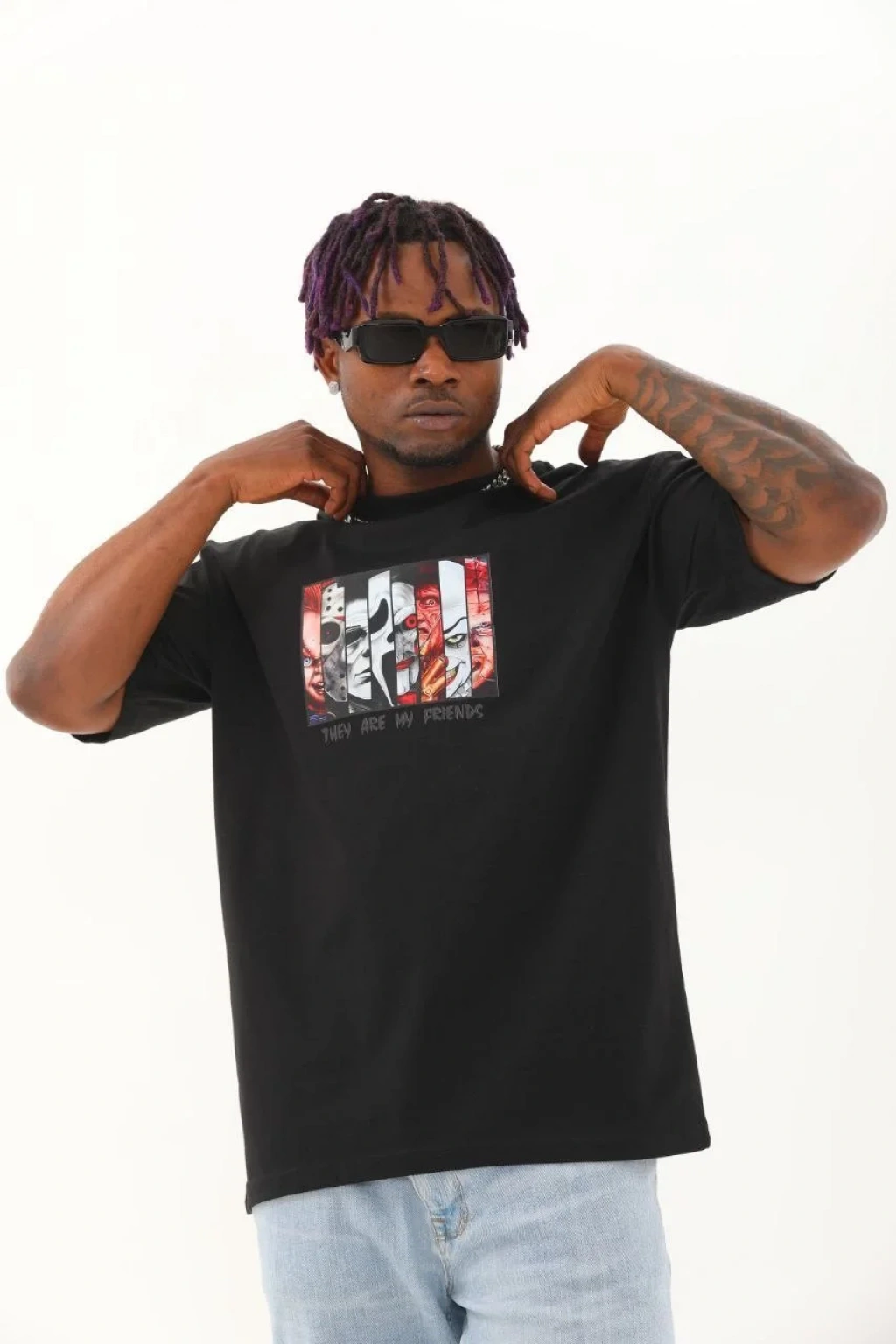 Unisex Oversize Baskılı Bisiklet Yaka T-Shirt - Siyah