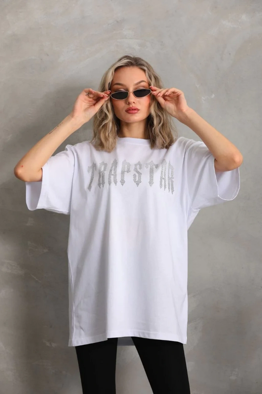 Unisex Taş Desenli Oversize T-Shirt - Beyaz