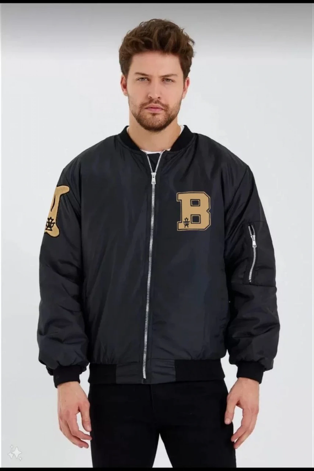 Unisex Uzun Kol Baskılı Bomber Ceket - Siyah