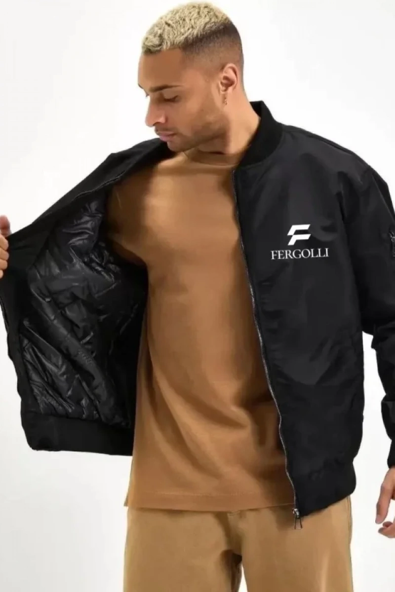 Tam Kalıp Uzun Kol Baskılı Bomber Ceket - Siyah