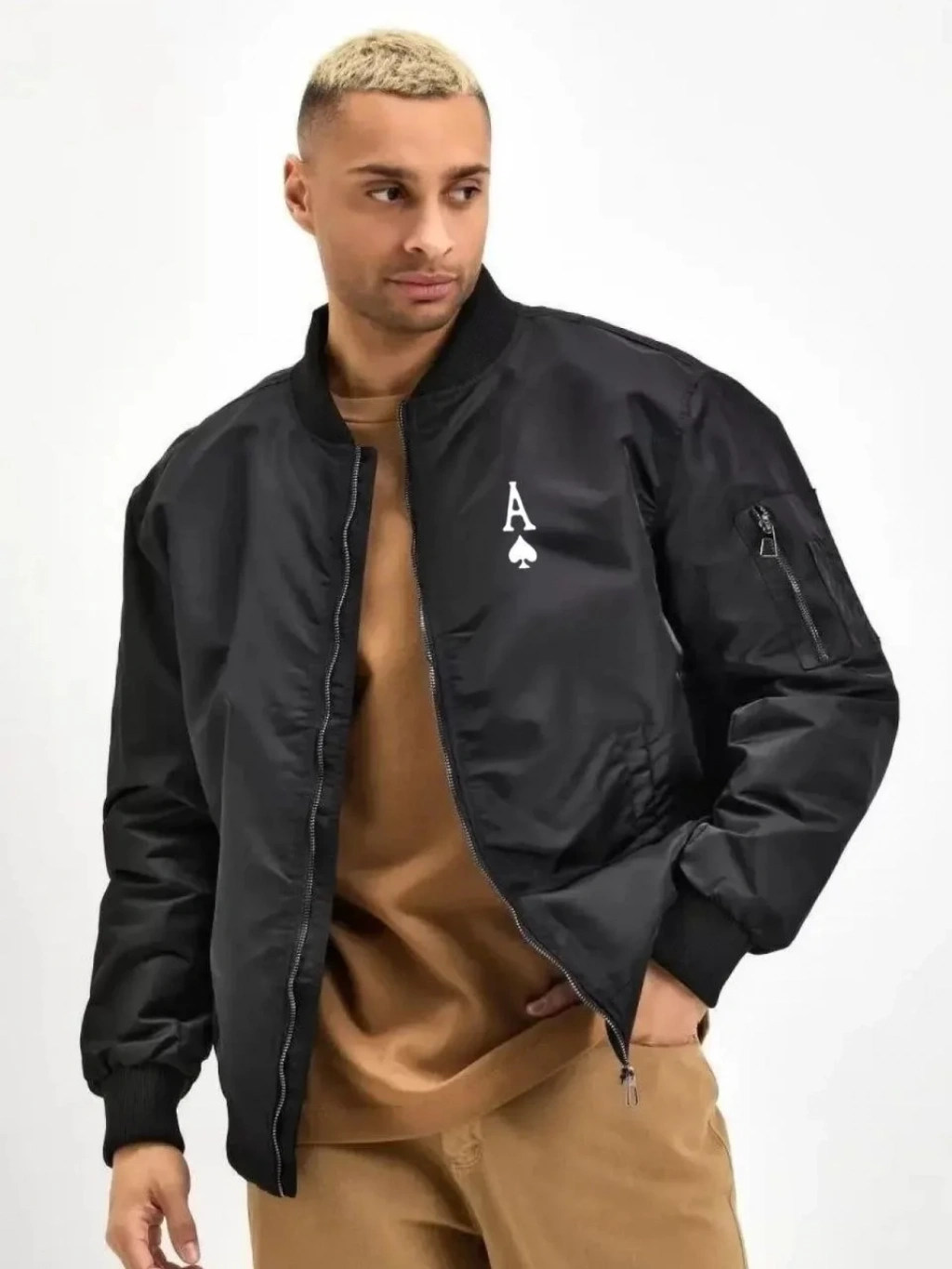 Unisex Uzun Kol Baskılı Bomber Ceket - Siyah