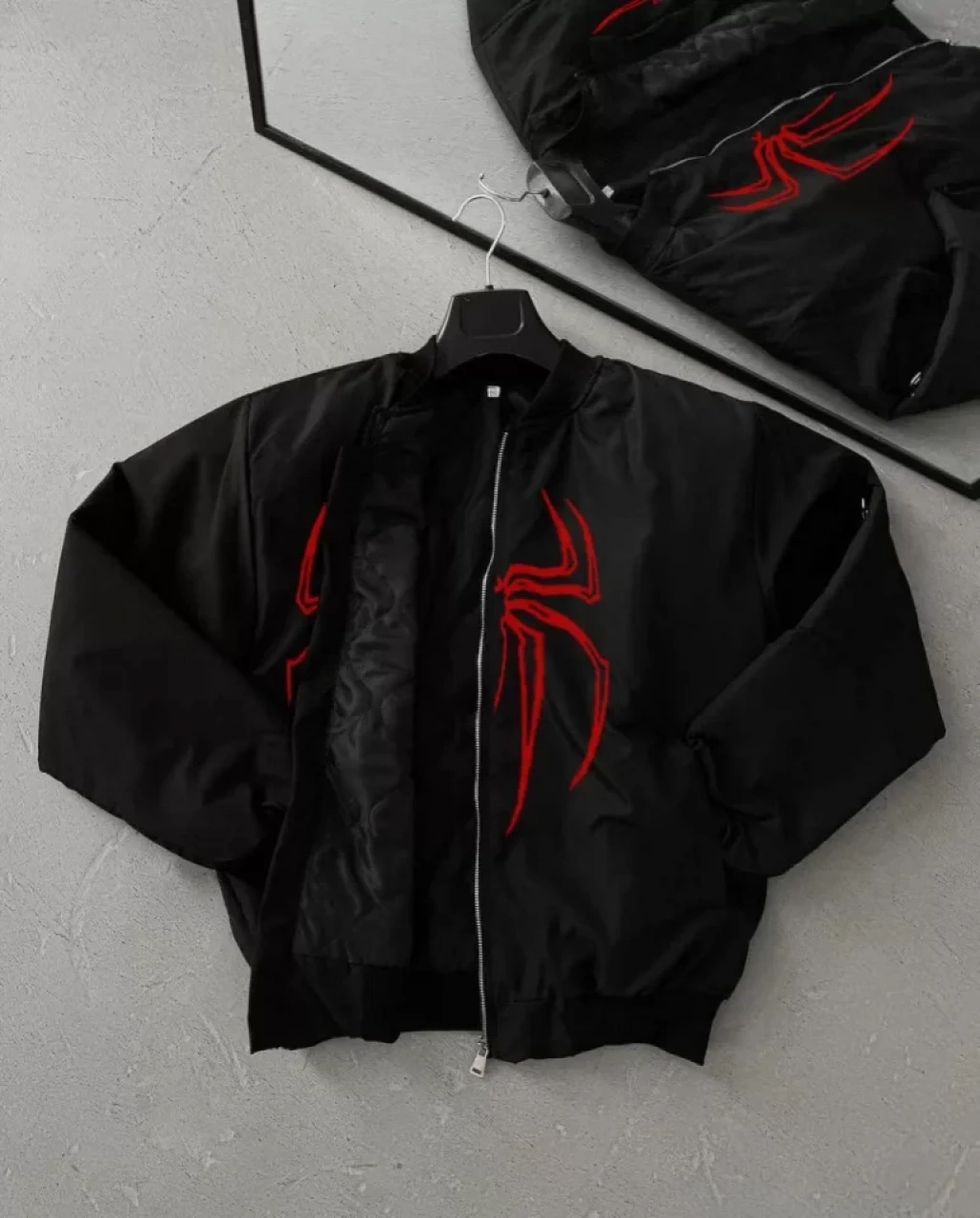 Unisex Uzun Kol Örümcek Baskılı Bomber Ceket - Siyah