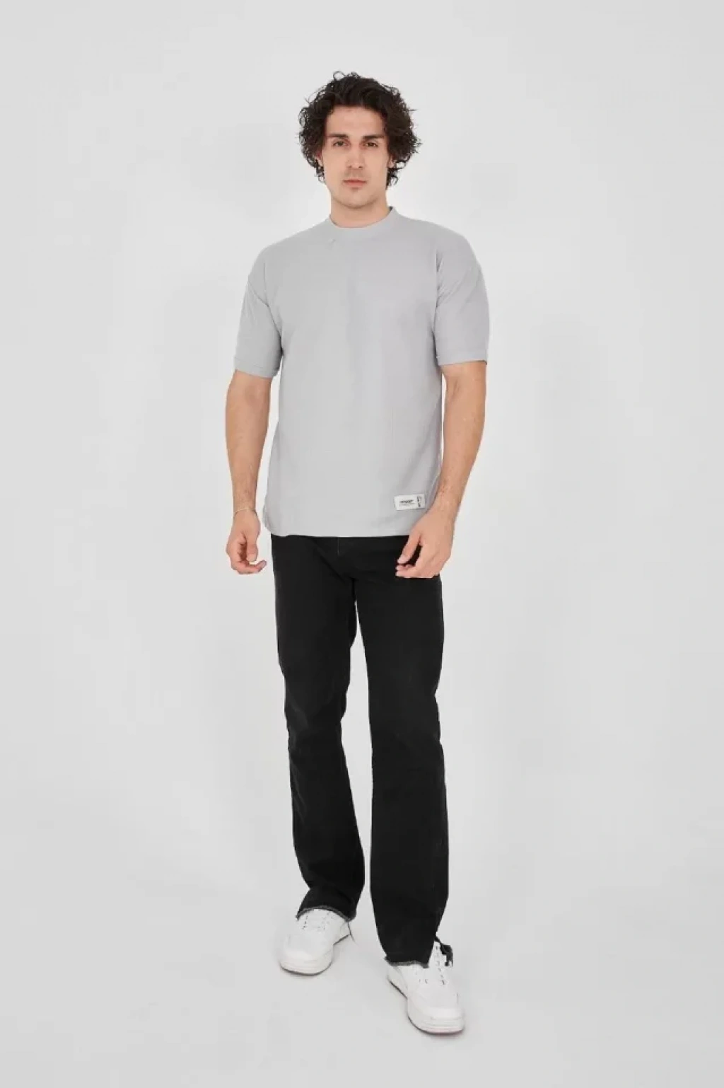 Unisex Waffle Kumaş Rahat Kol T-Shirt - Boyalı Gri