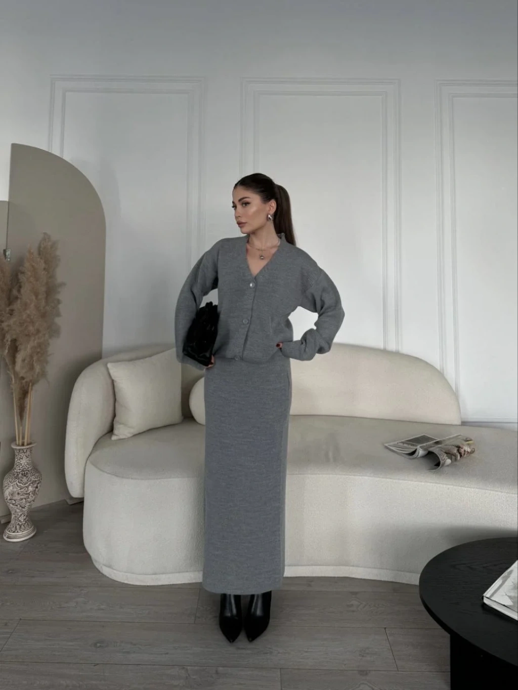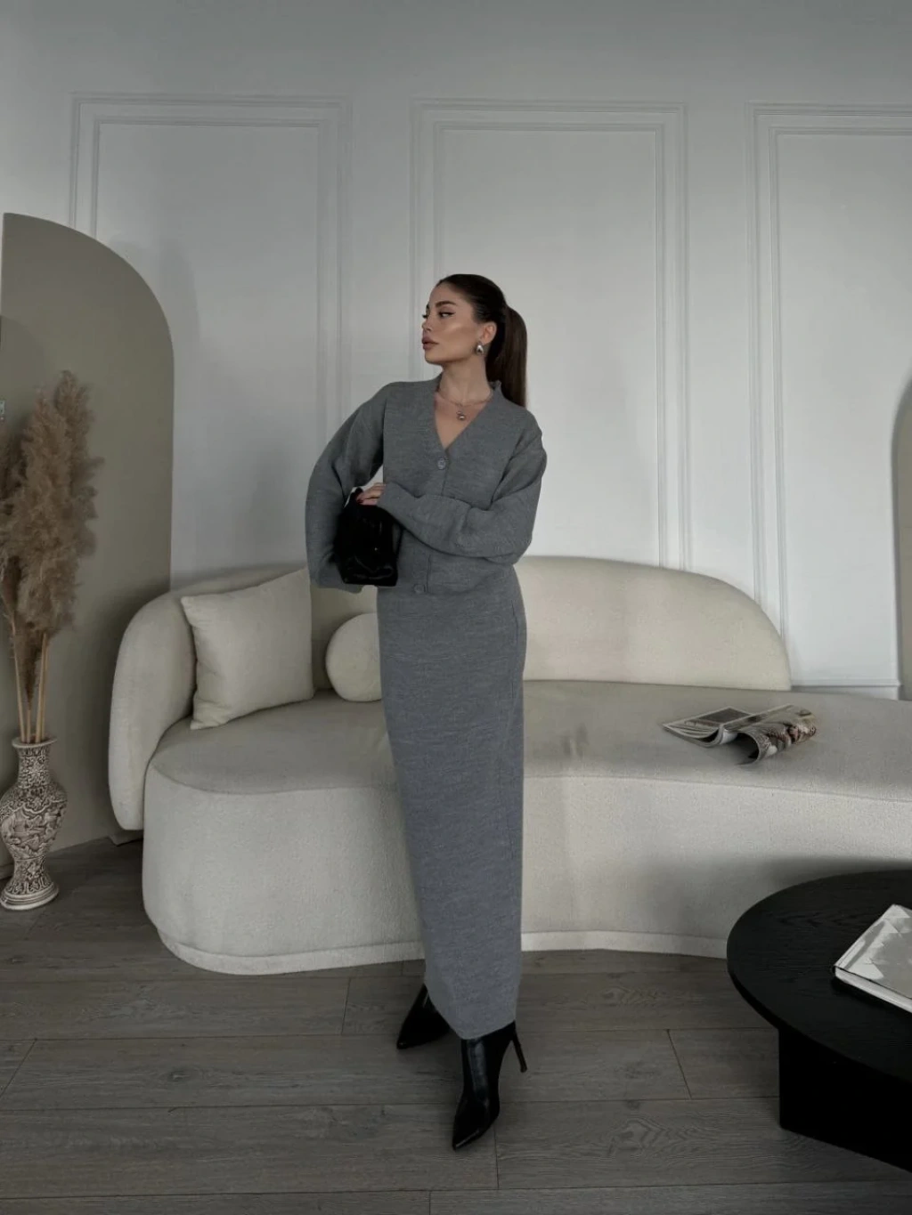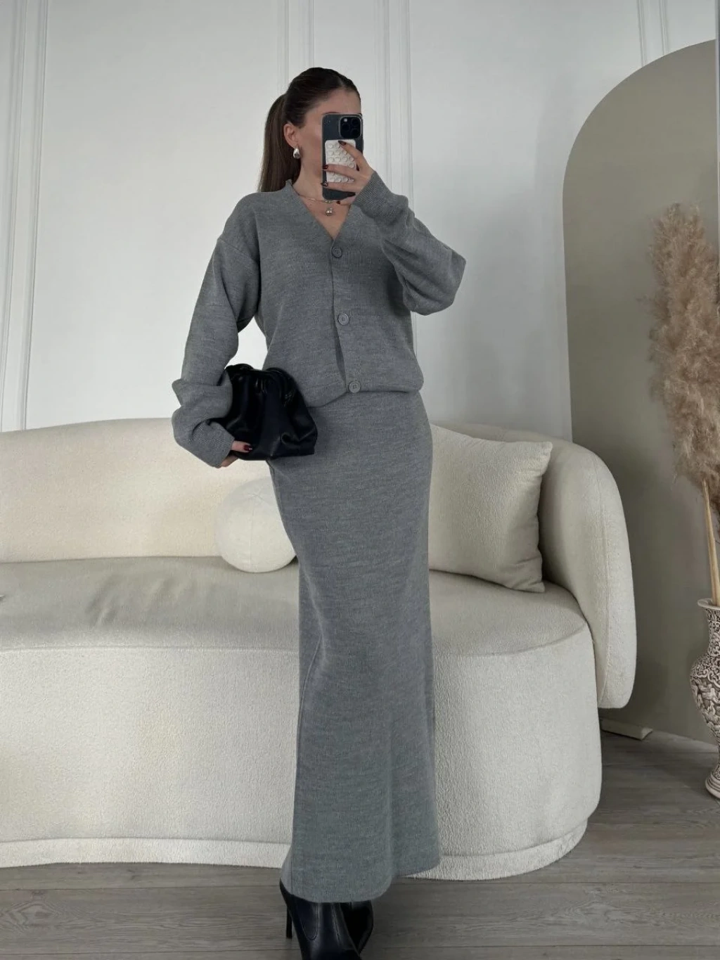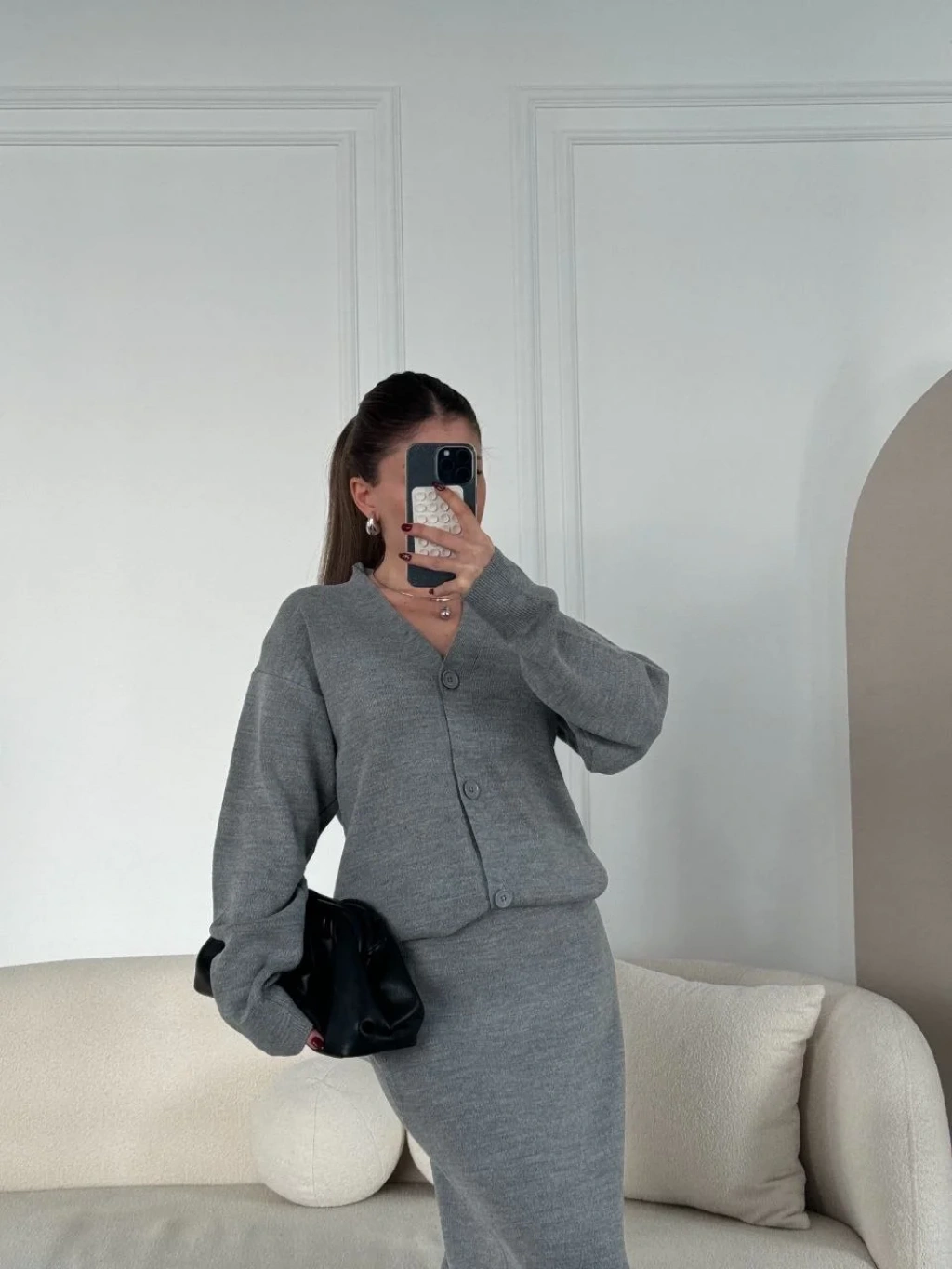 V Yaka 3 Düğmeli Hırka Takım Triko İkili Etekli - Gri
