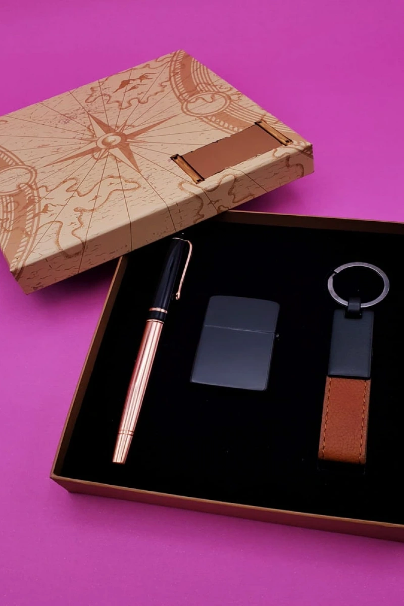 VIP 3'LU HEDİYE SETİ Ürün ÖzellikleriVIP 3'lü hediye seti, şık ve kaliteli tasarımıyla öne çıkmaktadır. Setin içerisinde yer alan kalem, anahtarlık ve çakmak, kaliteli metal, deri ve mukavva malzemelerden üretilmiştir. Kalem metal malzemeden yapılmış olup roller kalemdir. Çakmak ise siyah mat zippo modelidir ve benzinsiz olarak gönderilmektedir. Setin tamamı kişiselleştirilebilir ve özel lazer baskılarla isim yazılabilir. Set, özel kutusunda özenle sunulur ve hediye olarak mükemmel bir seçenektir.Paket İçeriği1 Adet VIP 3'lü Hediye Seti